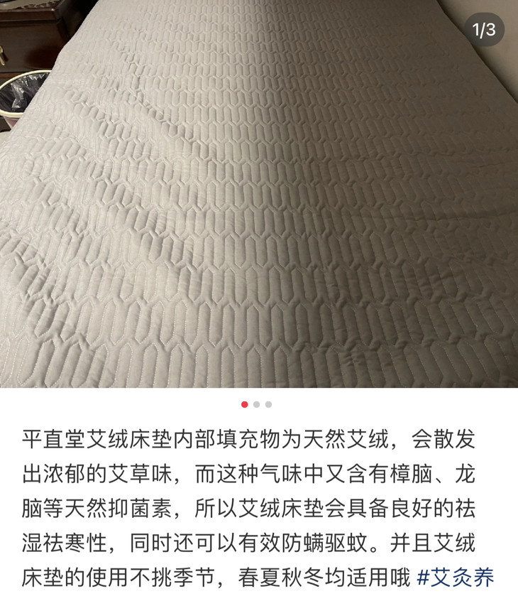 来自平直堂的艾绒床垫,选用的是“草本之都”南阳伏牛山的5年陈艾,那里的艾草,叶片肥宽、气味浓郁,天生就比普通艾草含更多挥发芳香油。平直堂趁端午时节,采下温热性能至好的艾草,50斤艾草提取1斤艾绒,做成“黄金艾绒”。再陈放5年,待燥热沉淀化为温润,才用于做床品,久用也不上火,温而不燥,躺在上面,仿佛给全身在做艾灸。这床床垫有6斤,艾绒就足足有4.5斤,至少用掉了200斤艾叶,用料是真良心了。