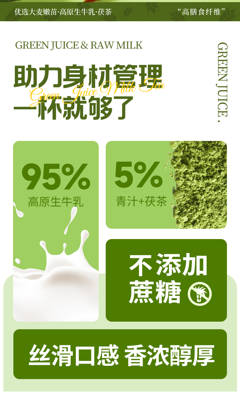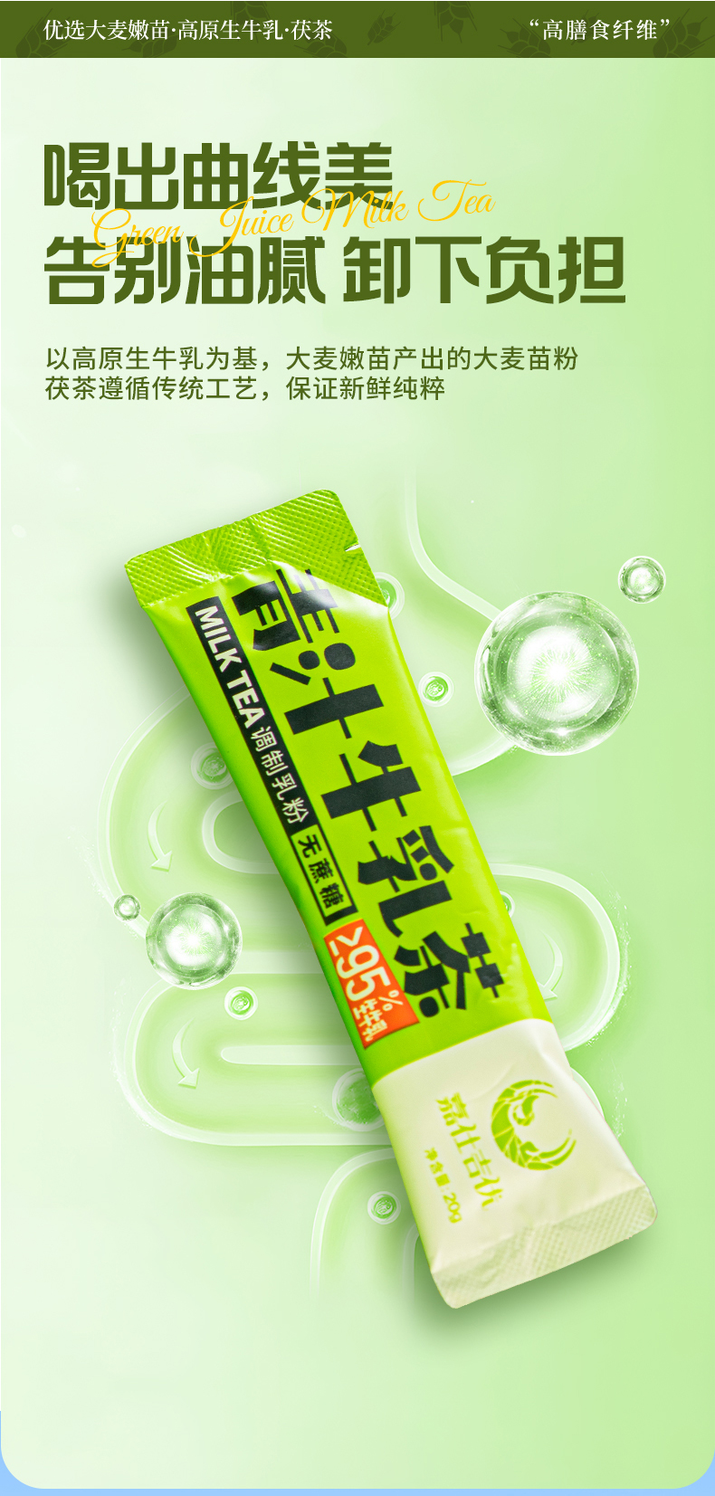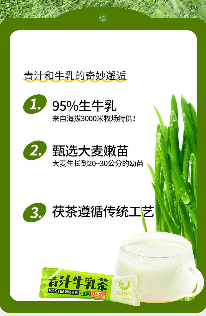 【青汁牛乳茶】95%高原生牛乳+青汁+茯茶,以高原生牛乳为基,大麦嫩苗产出的大麦苗粉,保证新鲜纯粹