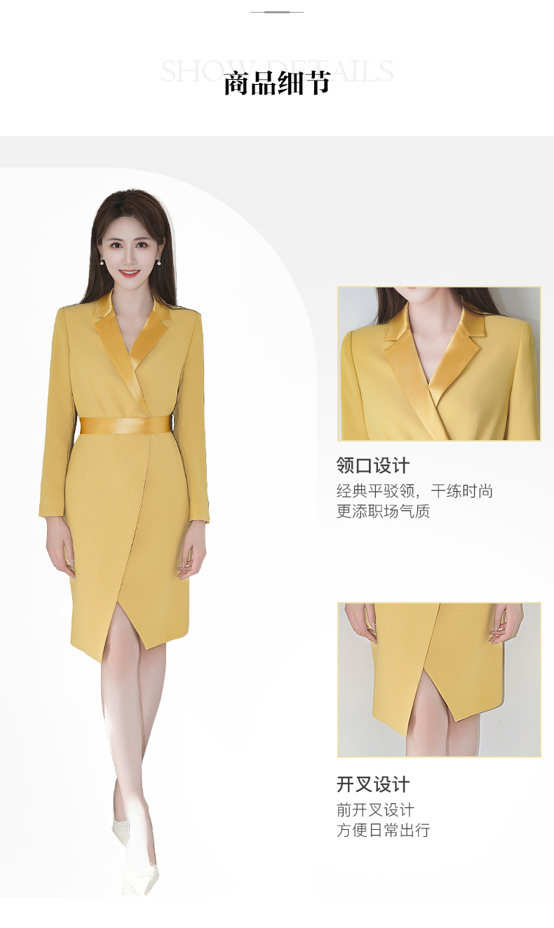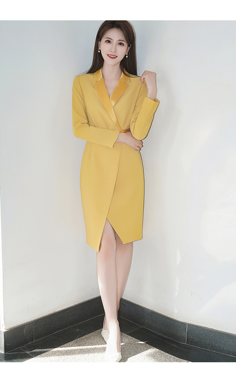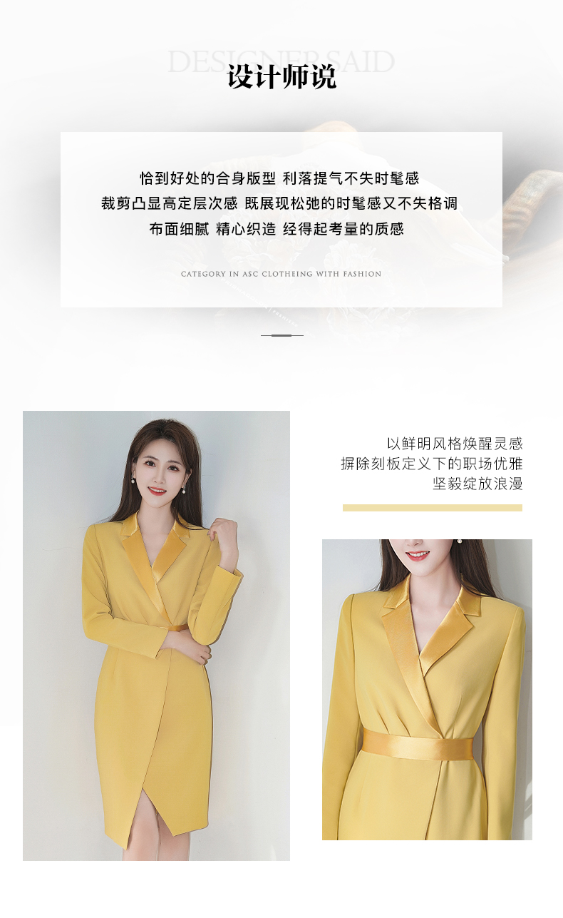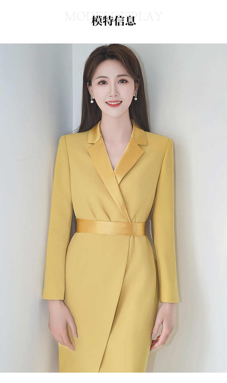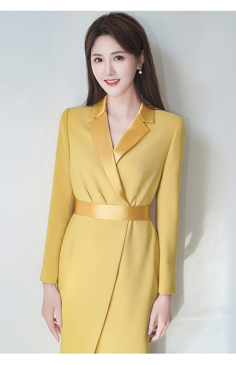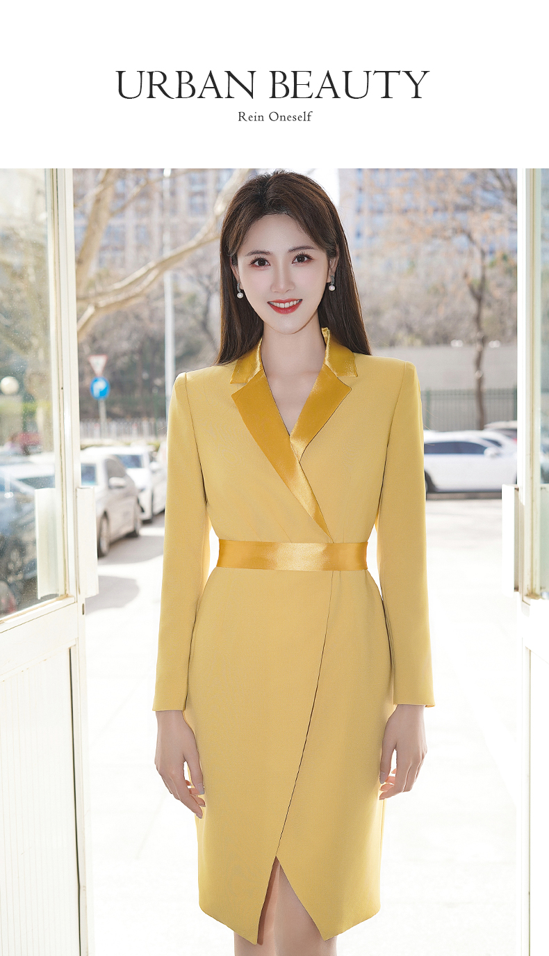 秋季高端洋气黄色连衣裙女长袖主持人时尚职业装西装裙宴会礼服