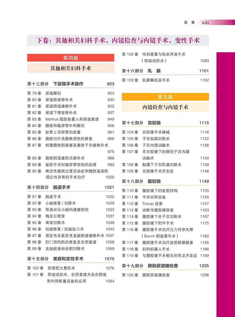 《盆腔解剖与妇产科手术图谱》是美国著名的妇产科专家 Michael S. Baggish、Mickey M. Karram 的著作,历经多次再版重修,并被译成多种文字,本书为第5版(中文版)。书中将盆腔解剖学与妇产科手术学结合,妇科手术学与相关的外科手术学结合,从局部解剖到手术步骤,以图片显示,辅以文字注释及讲解,由浅入深,内容广泛。全书分上、中、下三卷,内容几乎涵盖了妇产科所有的手术及所涉及的各个相关领域,是一部难得的、与妇产科手术相关的综合性国际精品专著。第5版的章节内容遵循上一版的逻辑解剖关系,层层深入和递进,便于阅读。高质量的插图是这套独特书籍的核心支柱,彩色图逐步取代了黑白格式,并随着每一个后续版本的增加而增加,从而改变了当代插图的标准,在第5版达到其*高数量。本卷为下卷,分为第四篇、第五篇及第六篇。第四篇阐述其他相关妇科手术,包括下尿路手术操作、肠道手术、美容手术和乳腺手术;第五篇阐述内镜检查与内镜手术,包括宫腔镜、腹腔镜和膀胱尿道镜检查;第六篇阐述变性手术。下卷新增第101章阴道成形术、会阴重建及阴道和外阴皮肤能量设备的应用和第102章性别重置与临床再造手术(阴道成形术)。