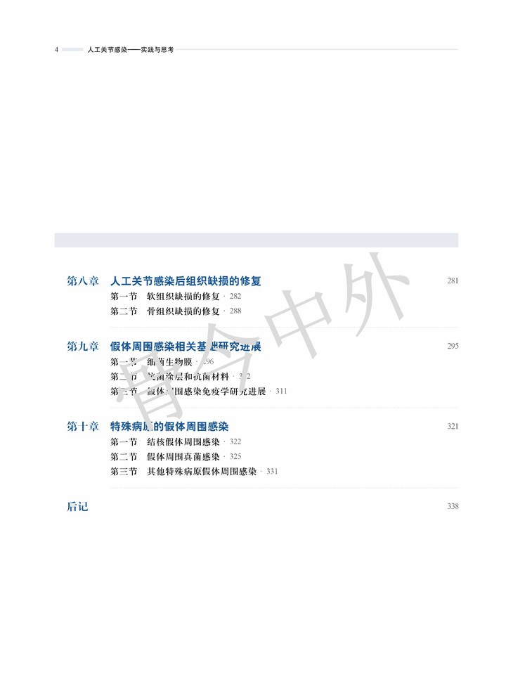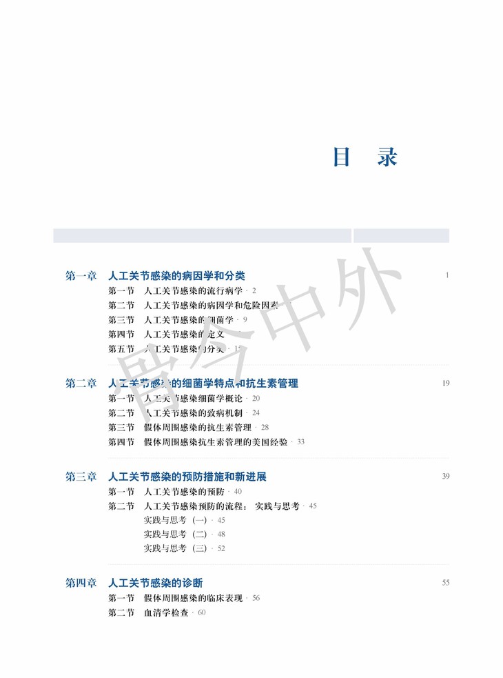 本书着眼于关节置换术后最严重的并发症,介绍人工关节感染相关预防、诊断和治疗知识,内容涵盖了人工关节感染的病因、分类、细菌学特点、抗生素应用等,借鉴国内外专家在诊断和治疗感染方面的原则和经验。此外还加以拓展,叙述了关节置换感染后组织缺损的修复方法、治疗失败后的挽救措施,以及细菌生物膜、假体周围感染免疫和假体抗菌涂层相关的研究进展。