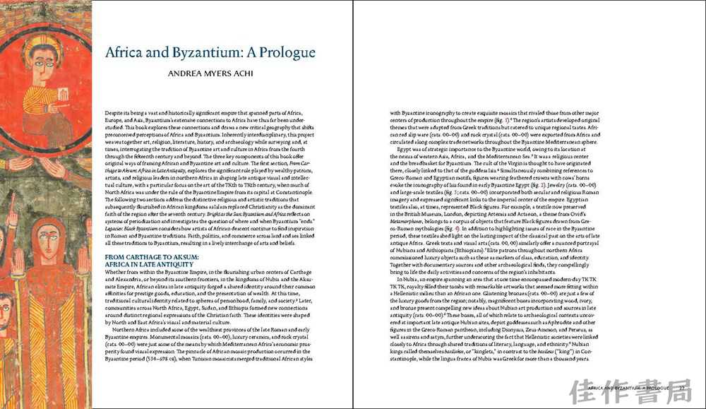 中世纪艺术史长久以来都聚焦于拜占庭帝国的辉煌,然而,努比亚、埃及、埃塞俄比亚以及其他强大的非洲王国对艺术做出的深远贡献却鲜为人知。这些王国与拜占庭之间至关重要的互动,对中世纪地中海世界产生了不可磨灭的影响。《非洲与拜占庭》一书汇集了170多件采用各种媒介和技术创作的杰作,包括马赛克、雕塑、陶器、金属制品、奢侈品、画板绘画以及宗教手稿等,展现了非洲在跨大陆贸易和文化交流网络中的核心地位。该书凭借深刻的学术研究和首次或罕见公开的全新作品摄影,揭示了晚期古代非洲令人惊叹的艺术成就,重新评估了非洲对前现代世界发展的贡献,并提供了一个更完整的历史视角,展现了非洲作为一个充满活力、多民族、多语言和多信仰的社会,在拜占庭乃至更广泛地区的艺术、经济和文化生活中所扮演的关键角色。