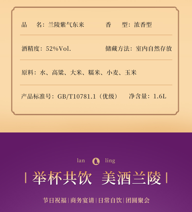 兰陵 紫气东来52度浓香型白酒1600mL 纯五粮工艺 固态发酵 礼盒装送礼必备