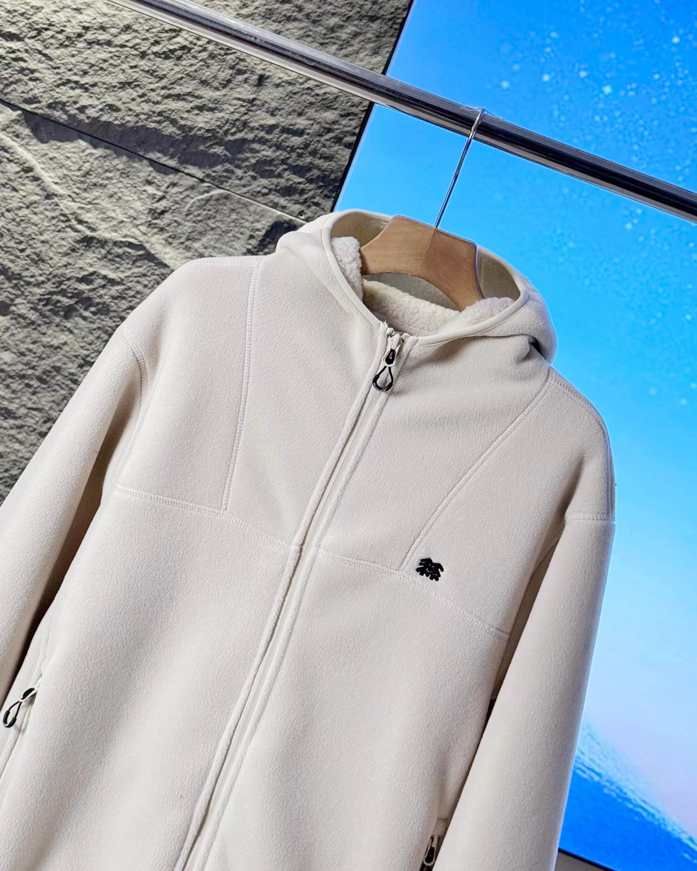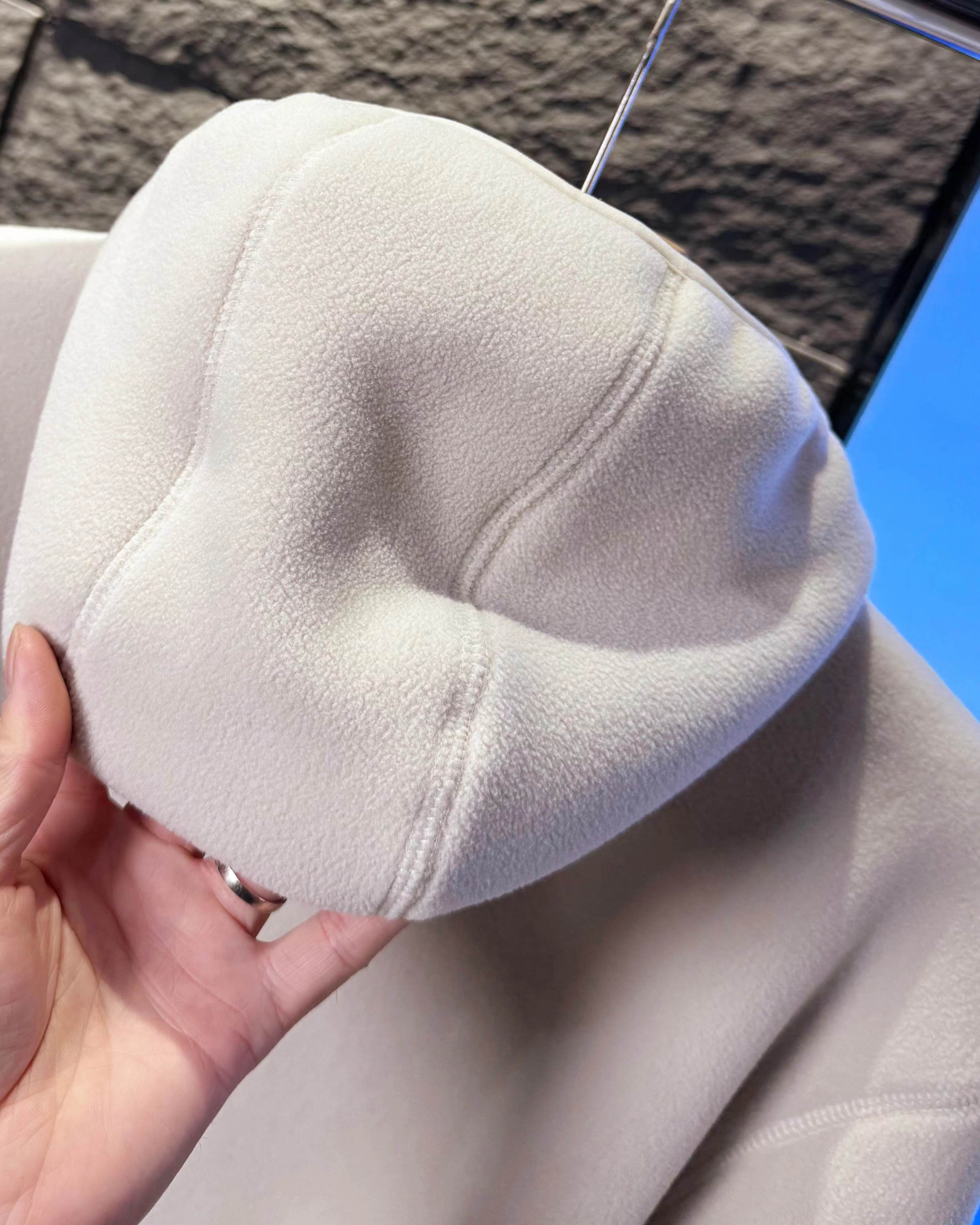 男士双层加绒加厚户外运动休闲连帽外套!优质面料:采用高克重摇粒绒面料,外层摇粒绒每一根绒毛都经过精心工艺处理,细腻柔软,不发硬、不粗糙。内里是绒毛内衬,亲肤舒适,保暖效果好。双重保暖:外套内外均为摇粒绒材质,外层粗颗粒绒防风、防潮、抗寒,提供基础防护;内层细密绒软糯亲肤、双面不起球,贴身舒适。摇粒绒内部独特的中空纤维结构能大量储存空气,双重锁温蓄热,保暖效果不输轻薄型羽绒服。细节设计:帽檐、领口、门襟全部采用精包边处理,久穿久洗不变形。袖口、下摆微微束口,防风保暖,还能显手腕纤细。下摆两侧是拉链式口袋,安全性高,且口袋内里做了微微磨毛处理,冬天把手伸进去也很暖和。时尚百搭:采用不挑人的落肩袖设计,肩型不挑男女,简约又百搭。抗静电处理:面料添加导电纤维,不易产生静电,不会吸附灰尘或毛发,穿着时不会出现噼里啪啦放电的情况,提升穿着体验。