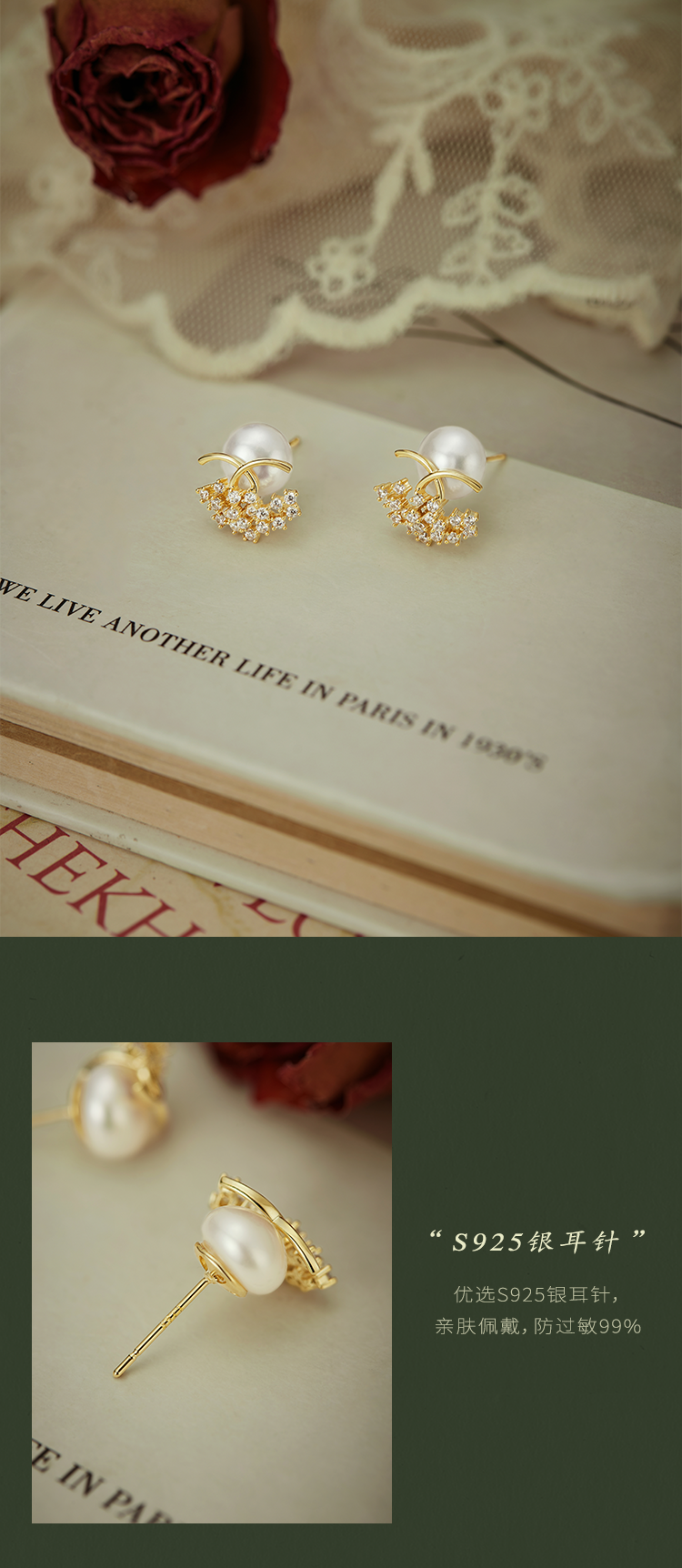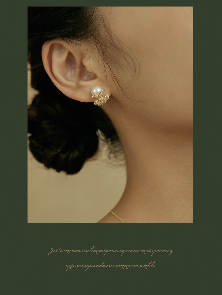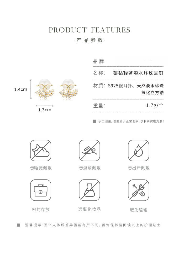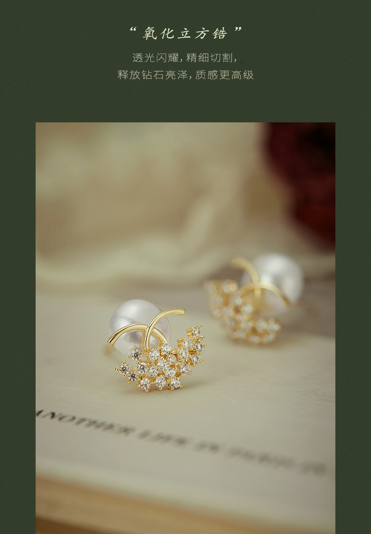 Oflye潮流饰品 镶钻轻奢天然淡水珍珠耳钉女新款耳环小众设计耳饰
