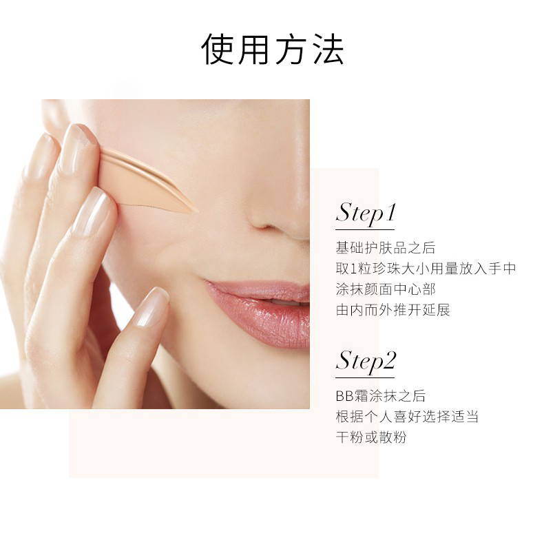 基础护肤之后使用BB霜,取一粒珍珠大小用量放入手中,涂抹颜面中心部,由内而外推开延展。