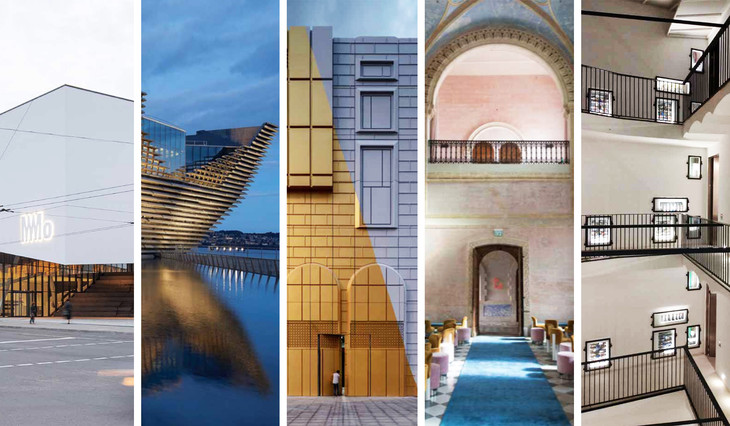 从左至右分别是MO现代艺术博物馆、邓迪V&A博物馆、“拓印”娱乐综合体、雅法酒店与芬迪实验基金会