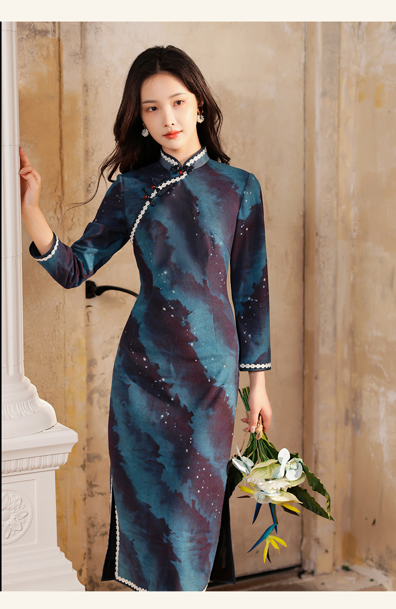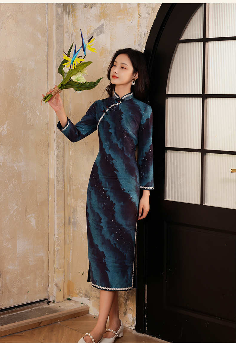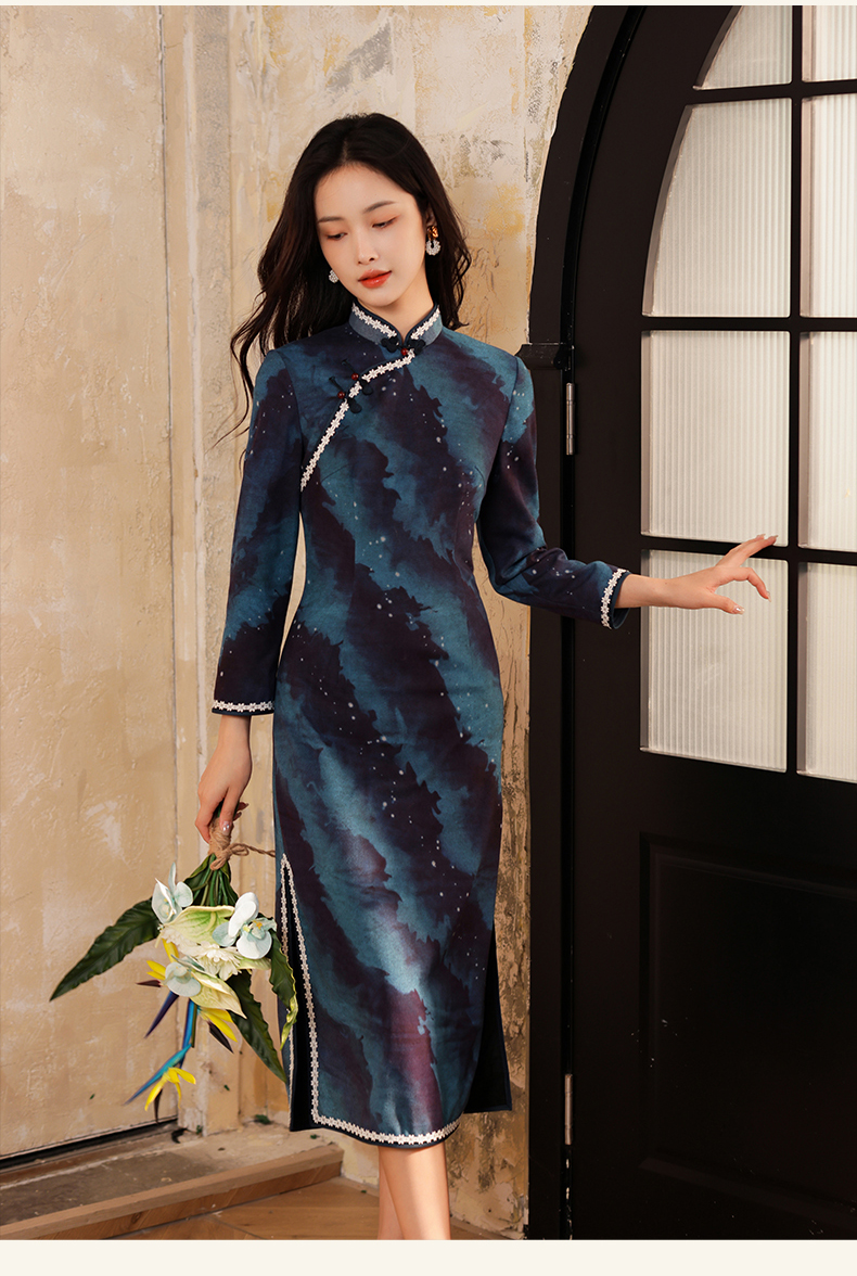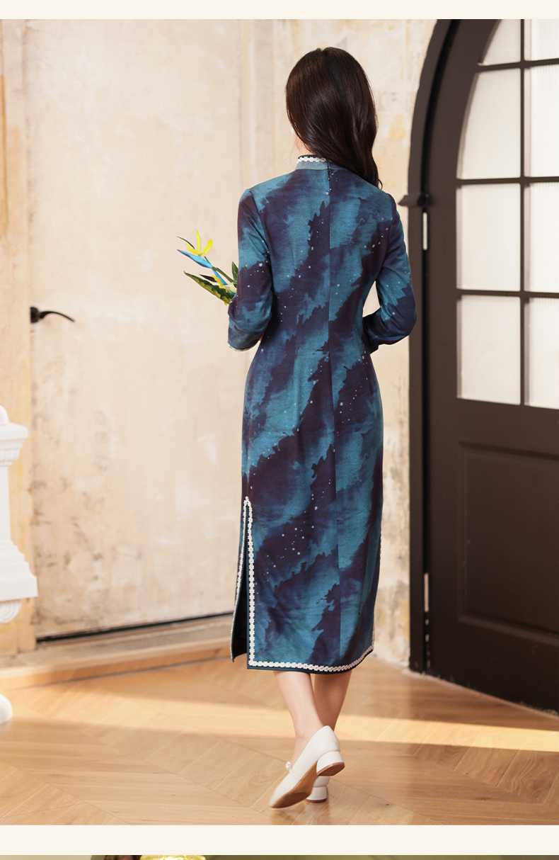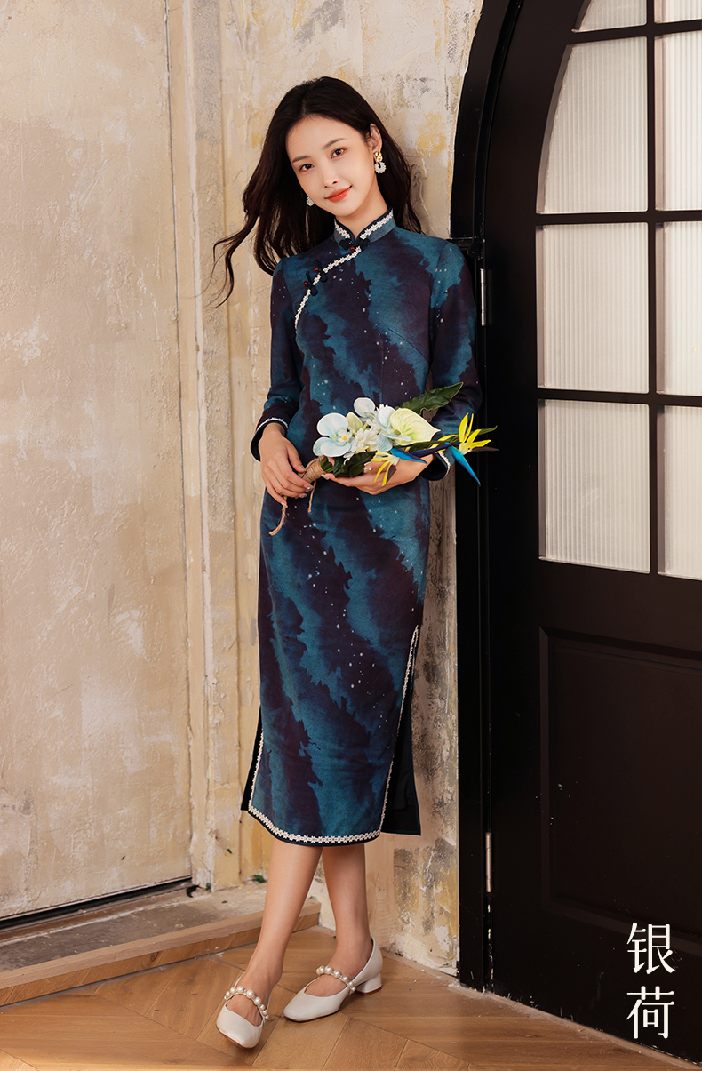 上海逸红颜银荷2025冬季新品磨毛针织新中式定位花日常长袖旗袍女