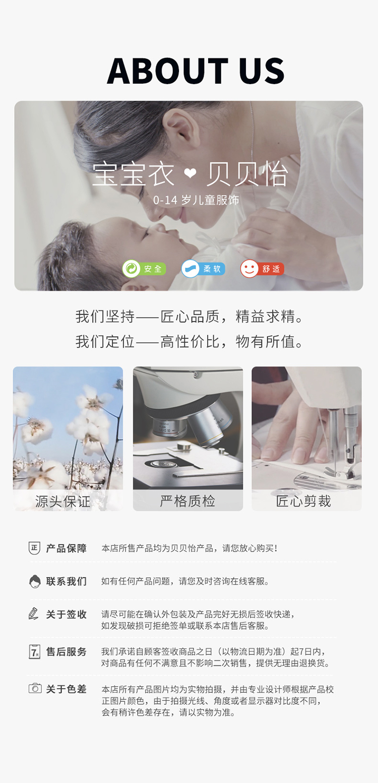 - 贝贝怡专注0-6岁婴幼儿服饰,坚持安全、柔软、舒适的产品理念,为千万中国家庭提供超高品质、安全可靠的婴幼儿服饰产品,妈妈放心,宝宝开心!