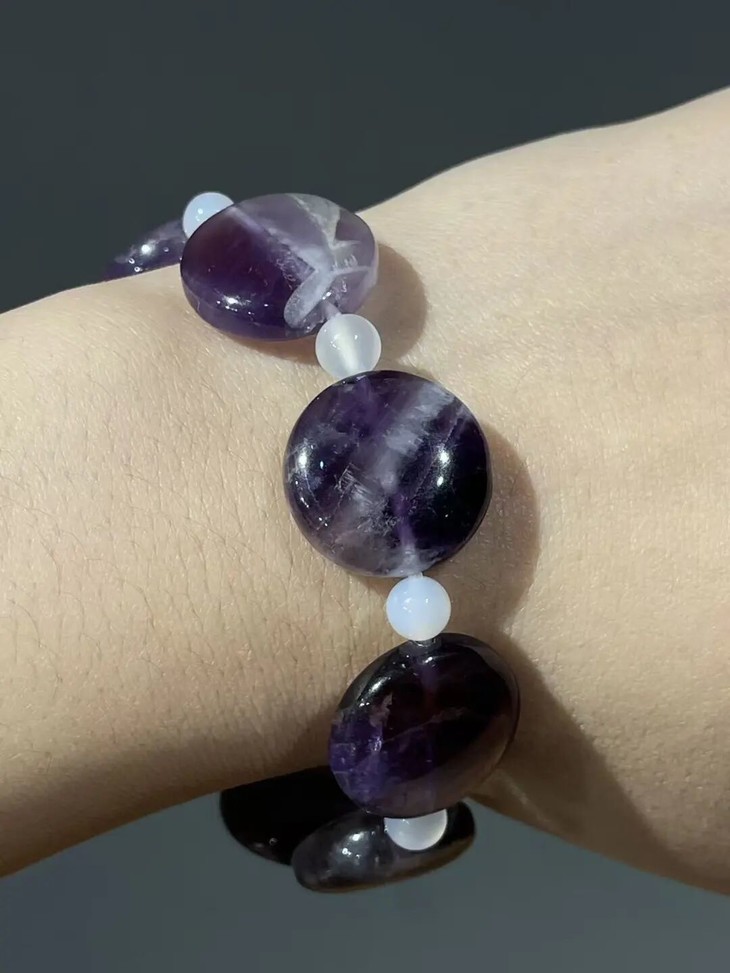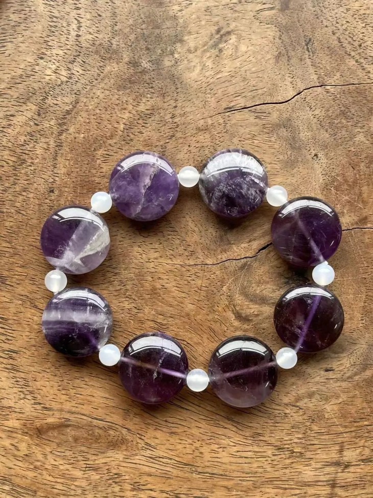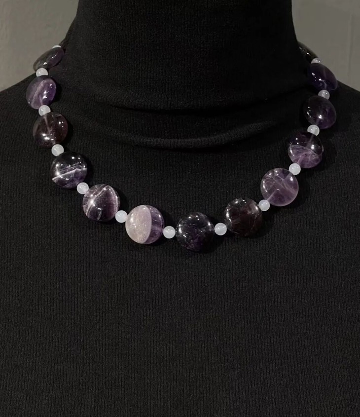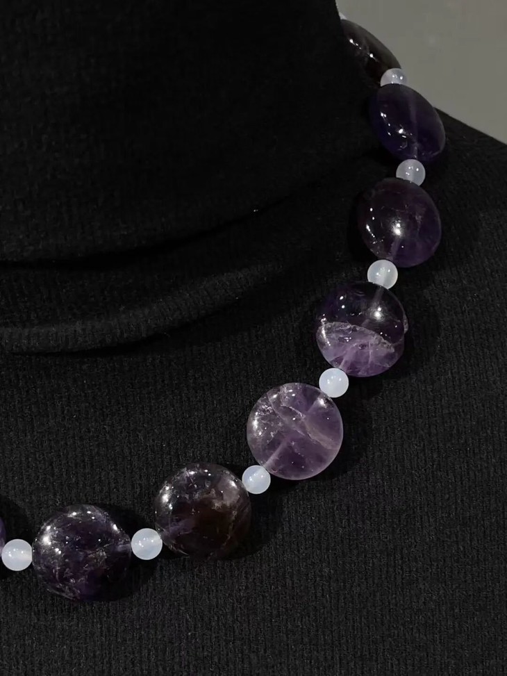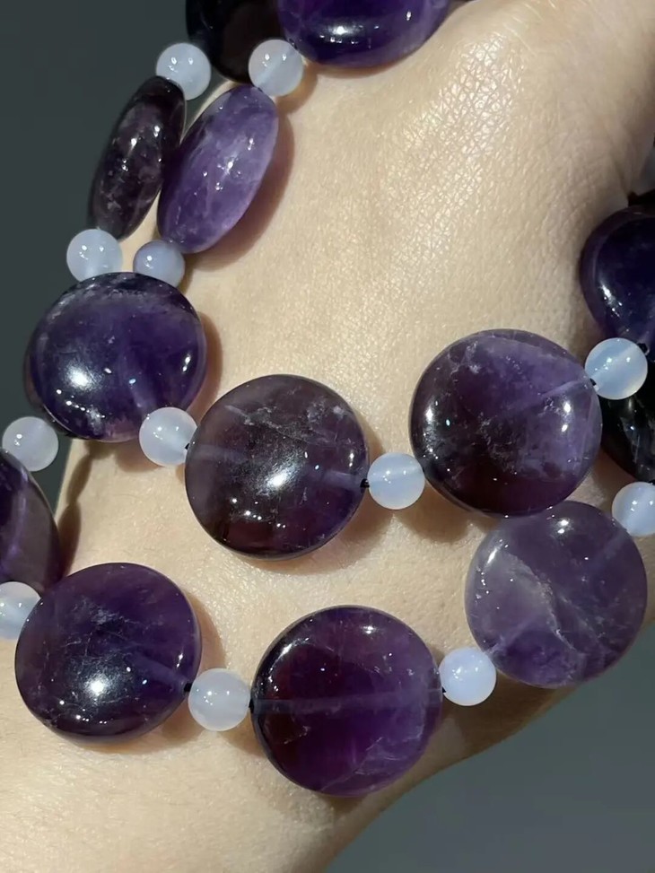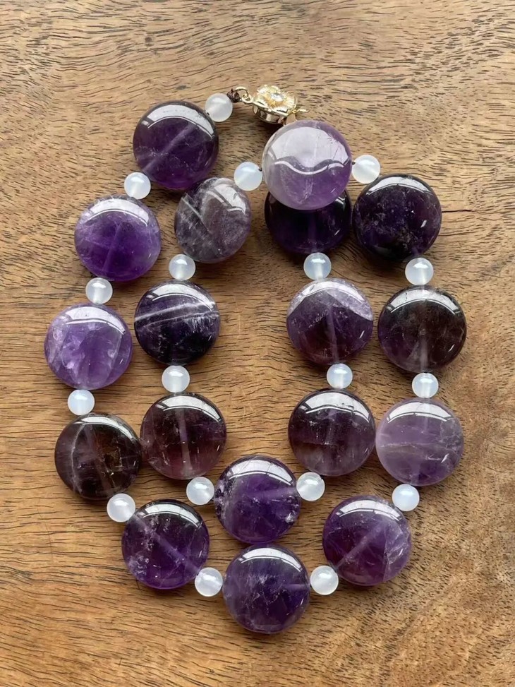 这是一组三十二粒紫色水晶扁圆珠搭配白玉髓设计而成的项链、银钩耳坠以及手链三件首饰套组,此组紫晶瓜棱扁圆珠,扁片圆珠形独特,晶莹透亮,色泽柔美的天然紫水晶。质地半通透,除少量天然白色杂质与石纹外质地纯净无瑕。共32粒紫晶瓜扁圆大珠,搭配白玉髓隔珠与鎏金扣环串成淑女項链与手链,以及搭配925银耳钩设计成一对耳坠。