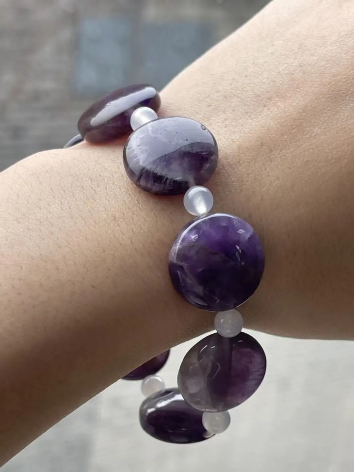 如此独特珠型与艳丽色彩的贵气紫晶扁圆珠设计成三件套组首饰,戴起来特别新潮时髦項链,手链与耳坠,是当代淑女入手即可天天佩戴,美丽大方,指尖盘玩舒坦静心。如图所示,此组天然紫晶瓜棱珠,除少数几粒突出棱角处有细微磕碰伤之外,保存完好。