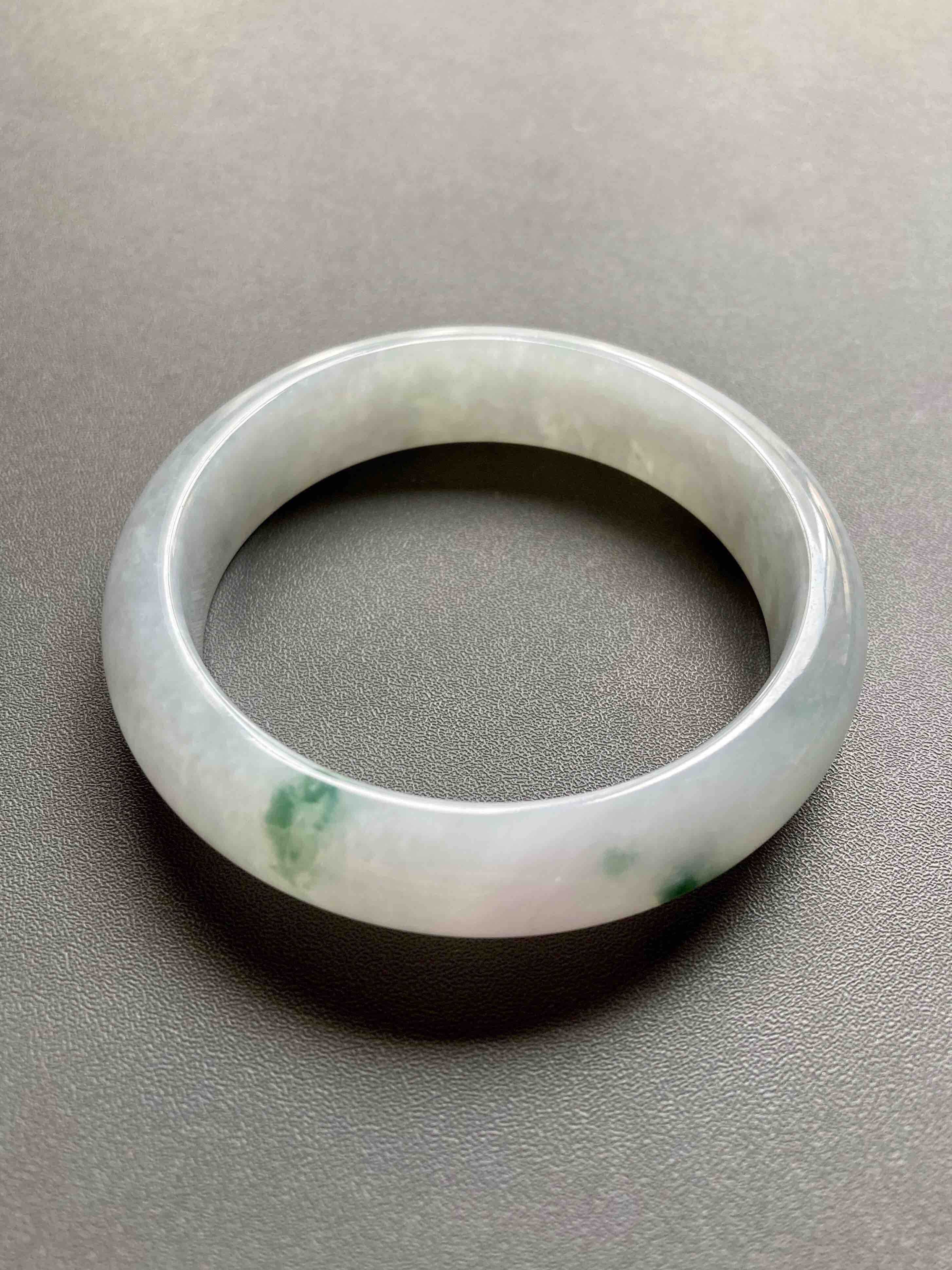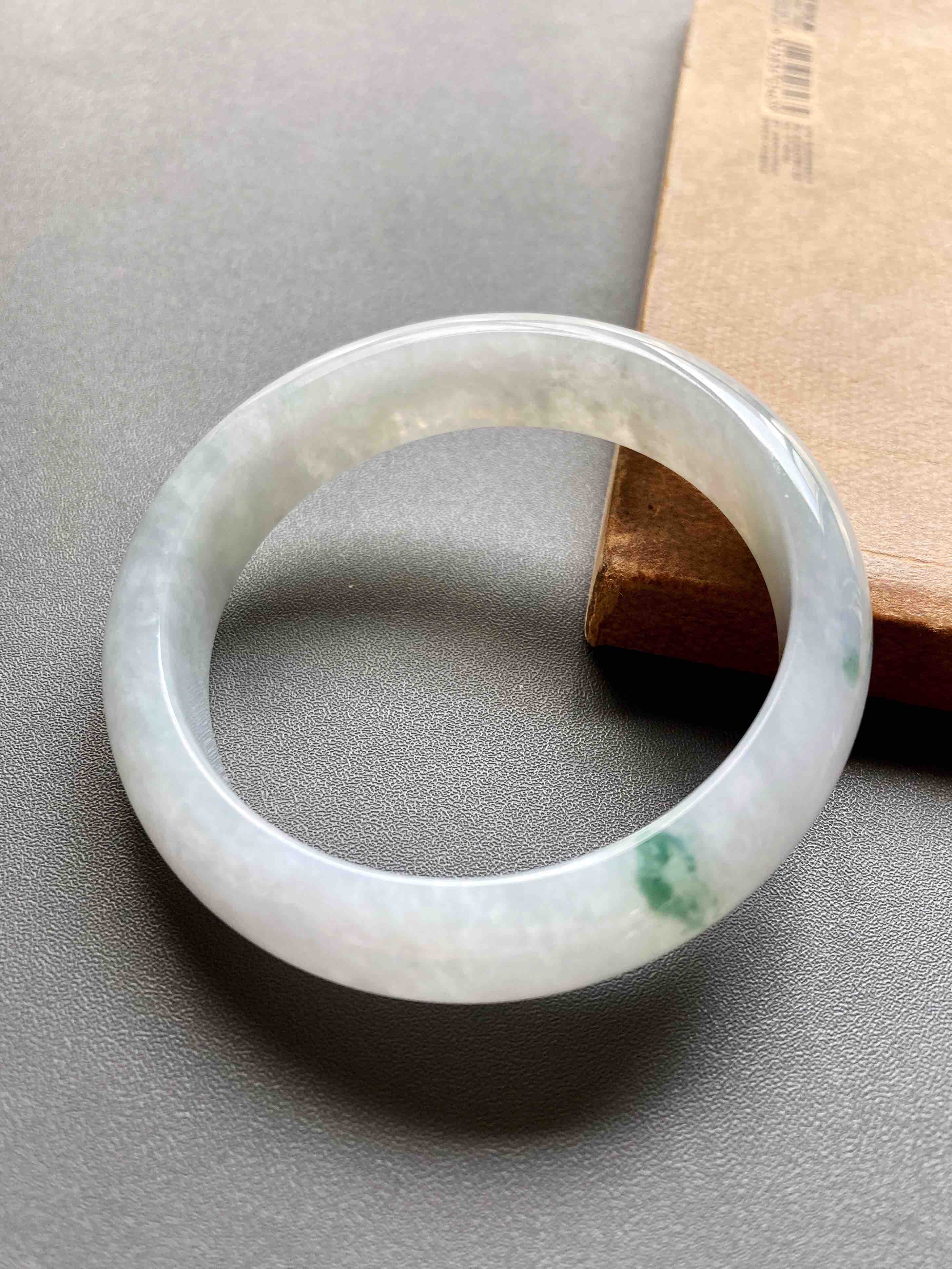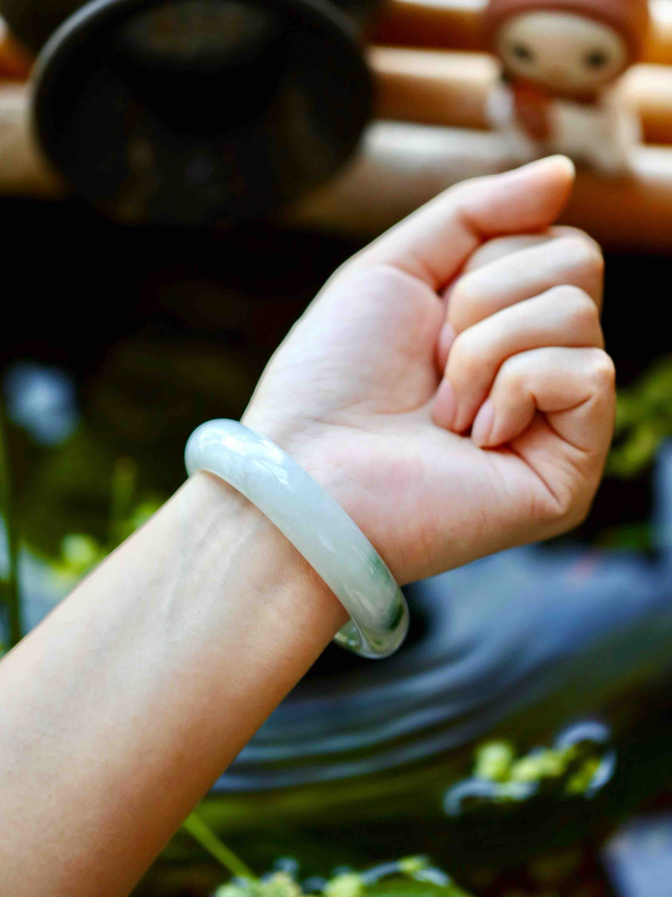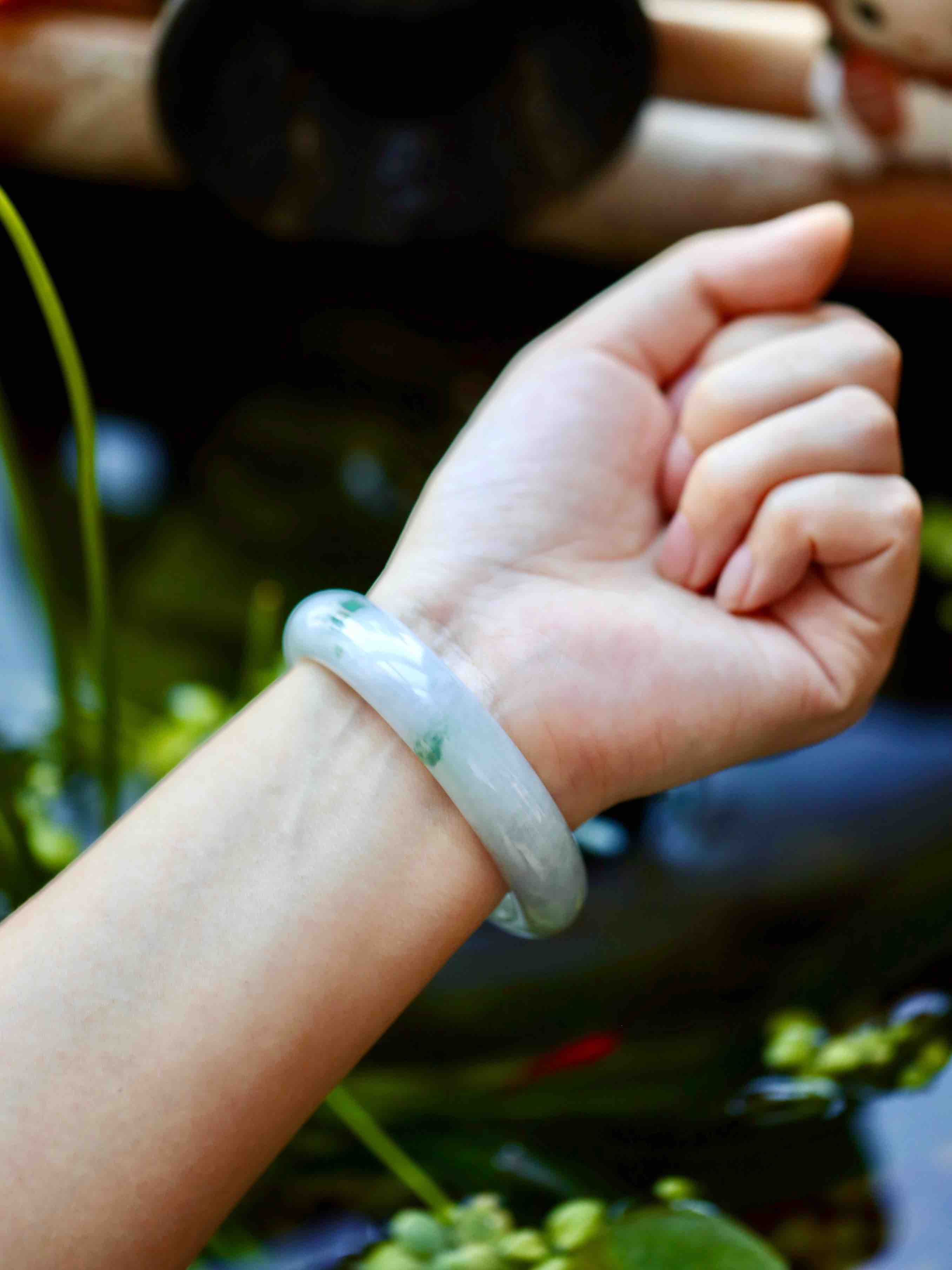 糯冰种飘花翡翠手镯57,晶莹剔透,果冻质感,飘花写意,气质清纯,种水特别细腻,很耐看的一只镯子,五位数的行情价,我们只要四位数,划算哎,内径57,宽14.1,厚7.9mm,手寸56到58都可以戴