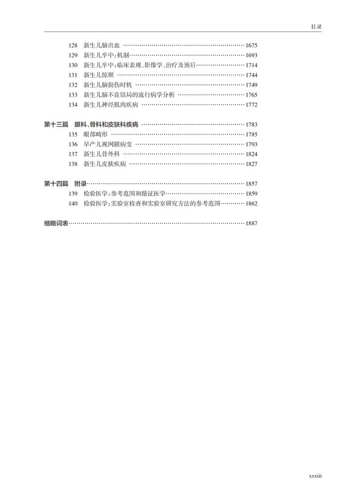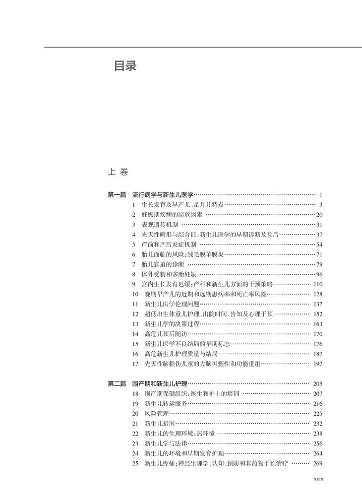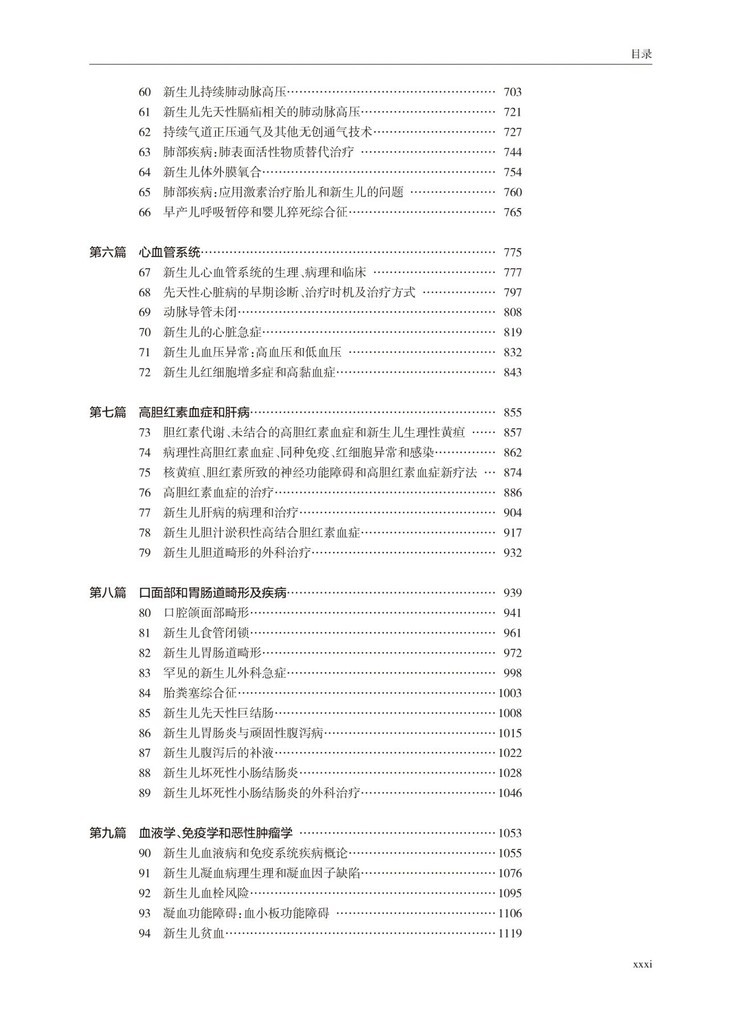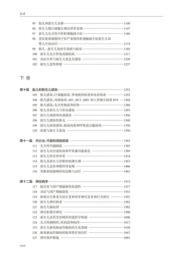 本书为上中下3卷,内容主要分为13篇。第一篇,描述了胎儿—新生儿发育相关的流行病学和胎儿医学从传统生理生物学到前沿科学如表观遗传学机制,探讨相关的风险因素。第二篇则讲到了治疗,包括围产期机构设置、高危转运输、复苏和氧疗作为最常规手段的利弊,出院后的家庭护理以及专科医生和护士的培训。第三篇讲述胎儿与新生儿营养与发育关系,以胃肠道的生理变化和发育中的内分泌环境到危重病的支持和康复。第四篇描述了在怀孕期间所应采取的用药问题,包括发育中的药理学和治疗综述。其中也涉及了糖尿病母亲的用药问题。第五篇讲述了复杂的呼吸系统疾病,从其发生发展和生理学,到呼吸支持和肺表面活性物质制剂的应用,包括肺部分子医学对特殊疾病诊治策略,涵盖从理论到到实际治疗应用的特点。第六和七篇讲述心血管系统、高胆红素血症和肝脏疾病。第八篇包括面部畸形和坏死性小肠结肠炎的治疗,术前和术后管理。第九篇包括血液学、免疫学和炎症,以及罕见但重要的新生儿恶性肿瘤。第十篇讲述感染及内分泌及代谢性疾病研究。第十一、十二和十三篇主要讲述神经病学,包括大脑的发育、损伤、电生理和影像学,以及相关的眼科、整形外科及皮肤科。