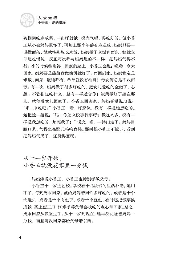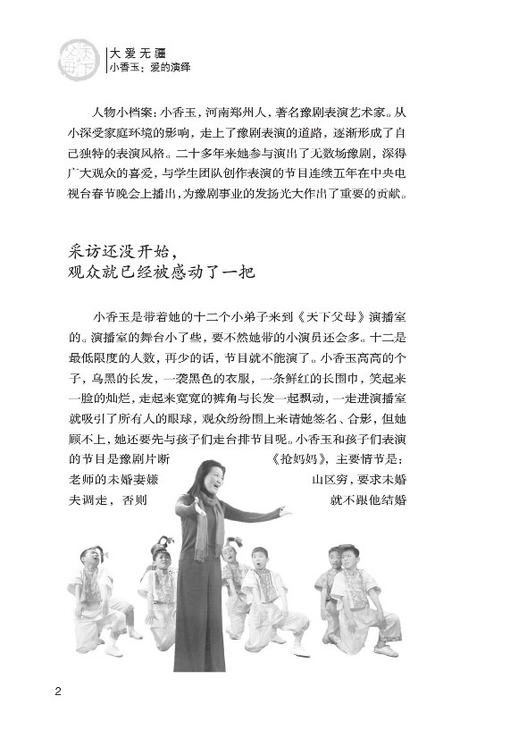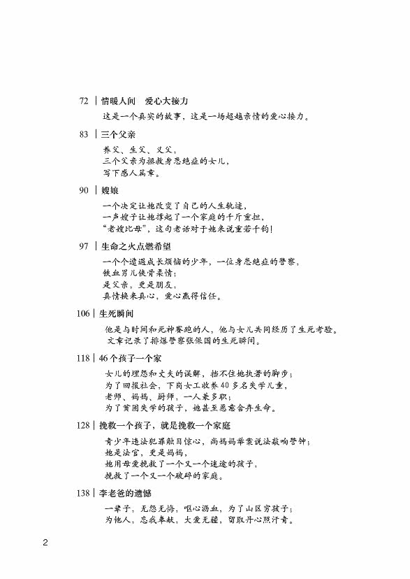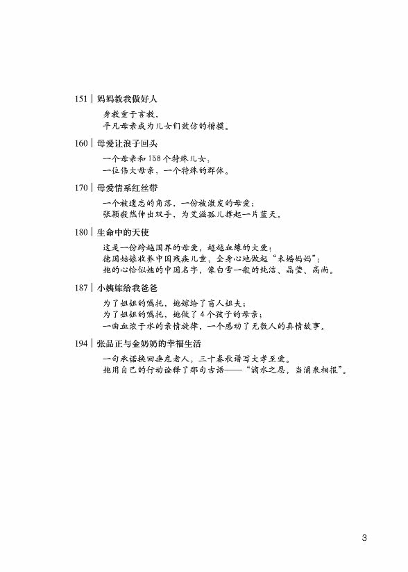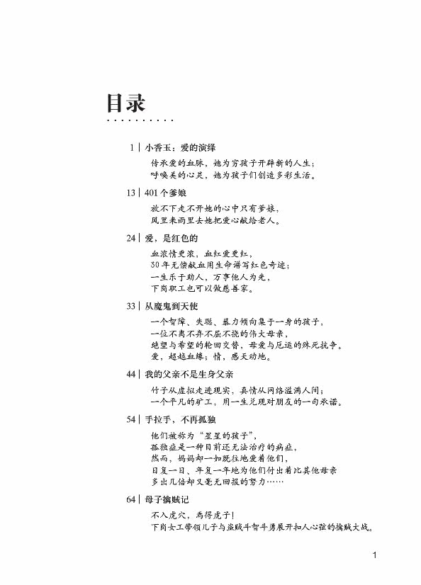 本书为“天下父母”丛书第三分册,该书收录的故事演绎了超越血脉关系的人间大爱。南京知青李振华扎根山区支教50多年,资助贫困学生2000多人,从自己微薄的工资里挤出37万元救助款。教过上万名孩子,考上大学的有7000多个,而自己的三个孩子却没有机会上大学;为了401个孤寡老人搭上一只眼睛的贾秀兰;做了158个刑满释放人员妈妈的韩雅琴;为了艾滋病孤儿四处奔波的张颖……给你讲述一个个鲜活而生动的大爱故事。这些人物用自己最灿烂的生命,回答了这个人类最初也是最终的命题——人生的意义。爱没有疆界,幸福也没有疆界。