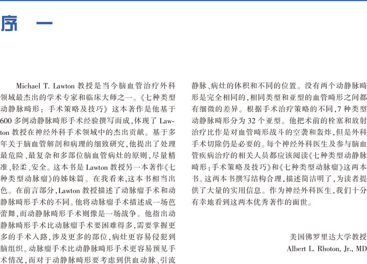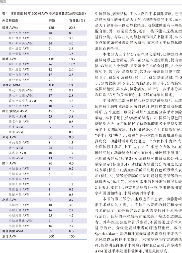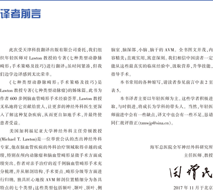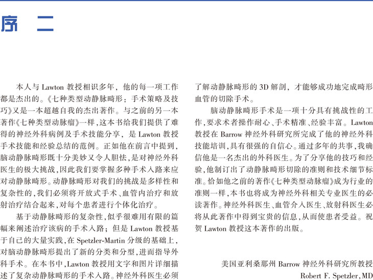 本书是迈克· T.劳顿教授(加利福尼亚大学神经外科中心的教授,神经血管外科主任)最畅销书籍《7种动脉瘤》的姊妹篇。主要阐述脑叶和脑深部区域动静脉畸形的显微神经外科切除技术,并将形式多样的动静脉畸形分类进行了简化。本书分为三个部分:第一部分总则,阐述动静脉畸形切除的8个步骤。第二部分分类阐述7种动静脉畸形,并对其32种亚型进行了解剖学和外科手术学描述。第三部分介绍如何选择病例。Lawton教授认为,选择适当的病例和应用多种治疗模式是动静脉畸形外科治疗成功的关键。