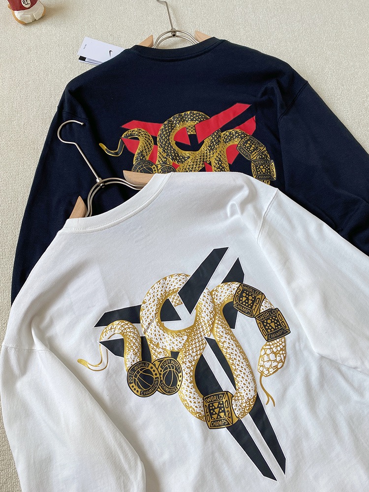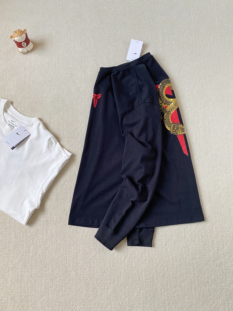 NIKE致敬KOBE的“曼巴之年”蛇年限定!科比黑曼巴系列长袖T,科比球迷看过来,蛇年长袖太绝了‼️胸前正中饰有经典科比剑鞘标志!长袖单品背后印有巨大的Kobe logo,金色蛇形图案环绕,并带🈶五枚冠军戒指图案,穿上这款宽松舒适的长袖,致敬科比五次夺冠,实现其篮球生涯宏伟目标的决心,落肩衣袖结合宽松版型,赋予长袖宽松休闲外观,针织面料柔软非凡,富有结构感,缔造舒适日常体验!👍