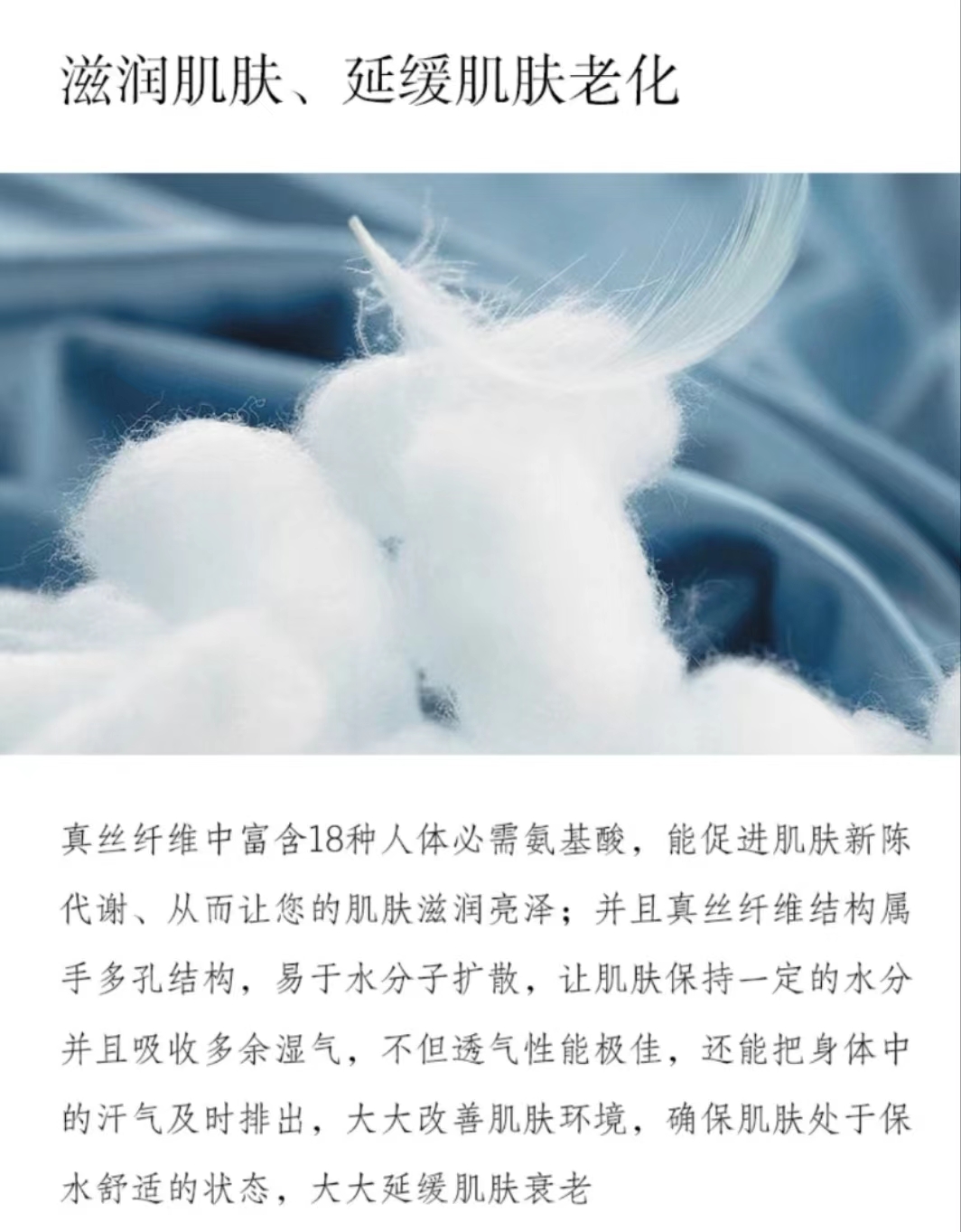 第二真丝的养肤性。真丝含有18种对人体有益的氨基酸,蚕丝做的衣服接触皮肤,能增进细胞的活力,抗衰老,帮助皮肤新陈代谢,保持皮肤滋润、光滑,所以明月很喜欢穿真丝的睡衣,睡觉也喜欢用真丝的枕套,对人体的健康和美容都有很大的帮助。