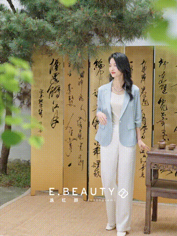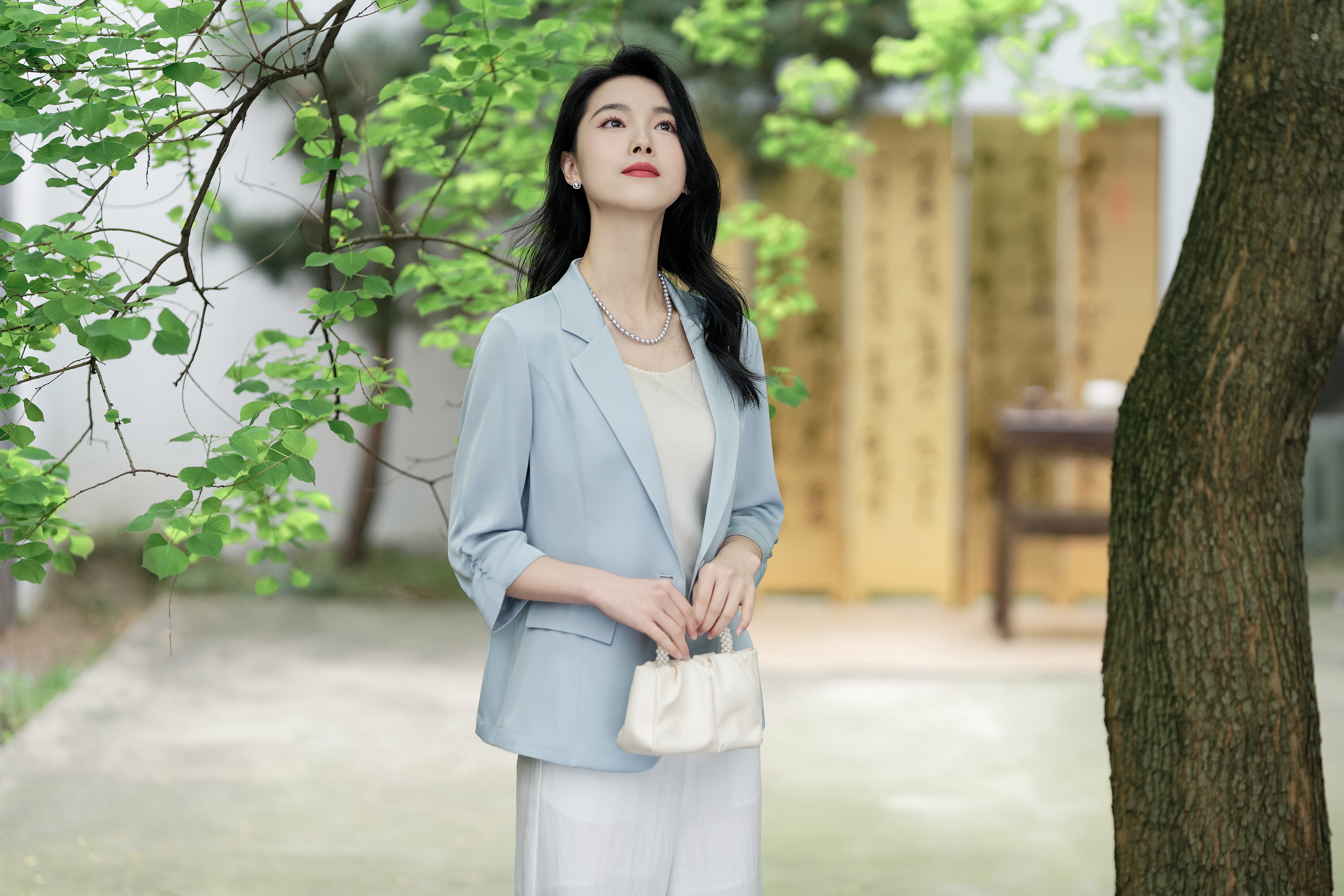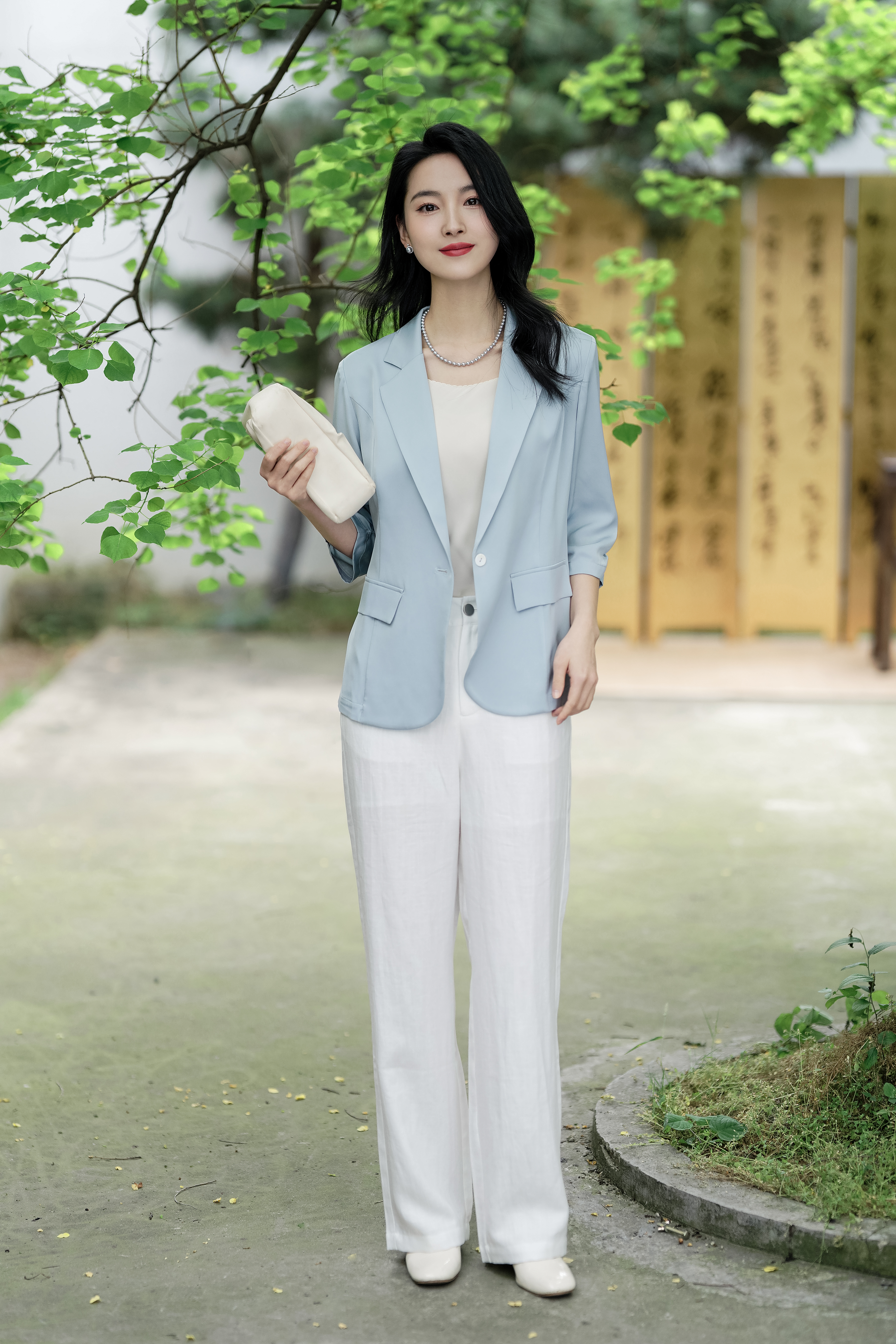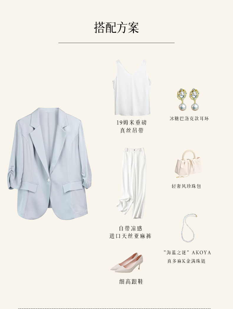 蓝色西装自带优雅气质,所以搭配上尽量选择米色或者白色系搭配,更显简单干净。模特是蓝色外套+米色真丝吊带+白色裤子,给人一种法式女主的感觉,再搭配【“海蓝之谜”AKOYA真多麻K金满珠链】+【冰糖巴洛克款耳环】,轻松营造出浓郁的高级感!