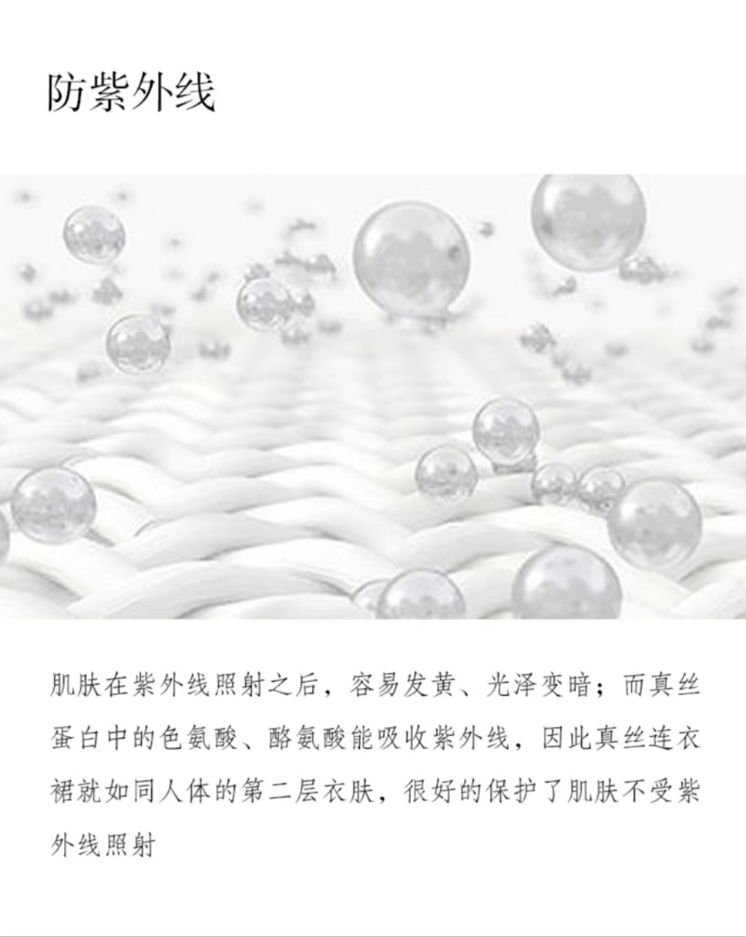 第三真丝的抗紫外线作用。真丝在太阳下面暴晒会变黄,是因为真丝吸收了阳光中的紫外线。紫外线对人体皮肤非常有害,真丝的服装可以起到预防紫外线的功效,避免紫外线直接造成对人体皮肤伤害。