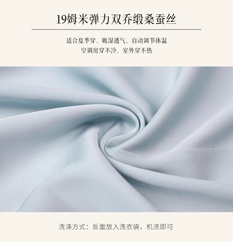面料选自19姆米弹力双乔桑蚕丝,含92%桑蚕丝+8%的氨纶,比常规的真丝更多了一份“糯”感和“微弹”,柔软无骨,有很好的透气性和悬垂性,垂坠感将衣身的流畅线条呈现,手感就像牛奶一般丝滑细腻,柔滑润泽,莹润的光泽,室内看着都非常显贵气,特别是在阳光下的质感更不趋于平淡。