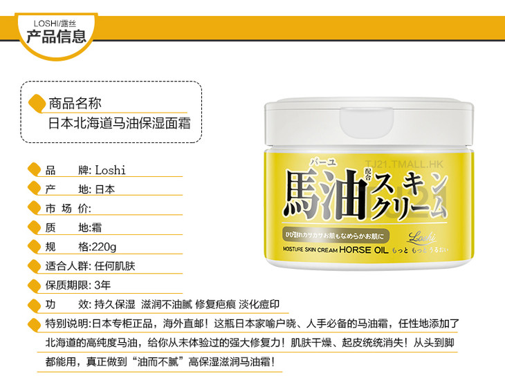 【保税区包邮直发】日本 LOSHI 北海道马油霜 220g