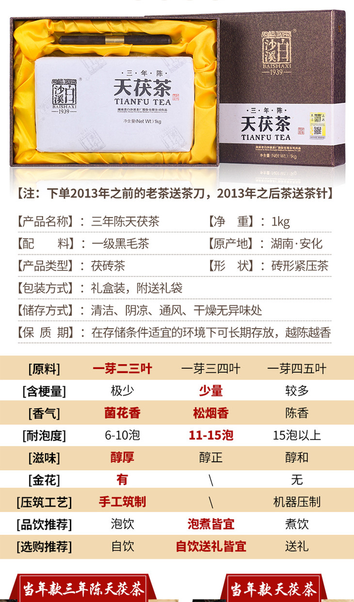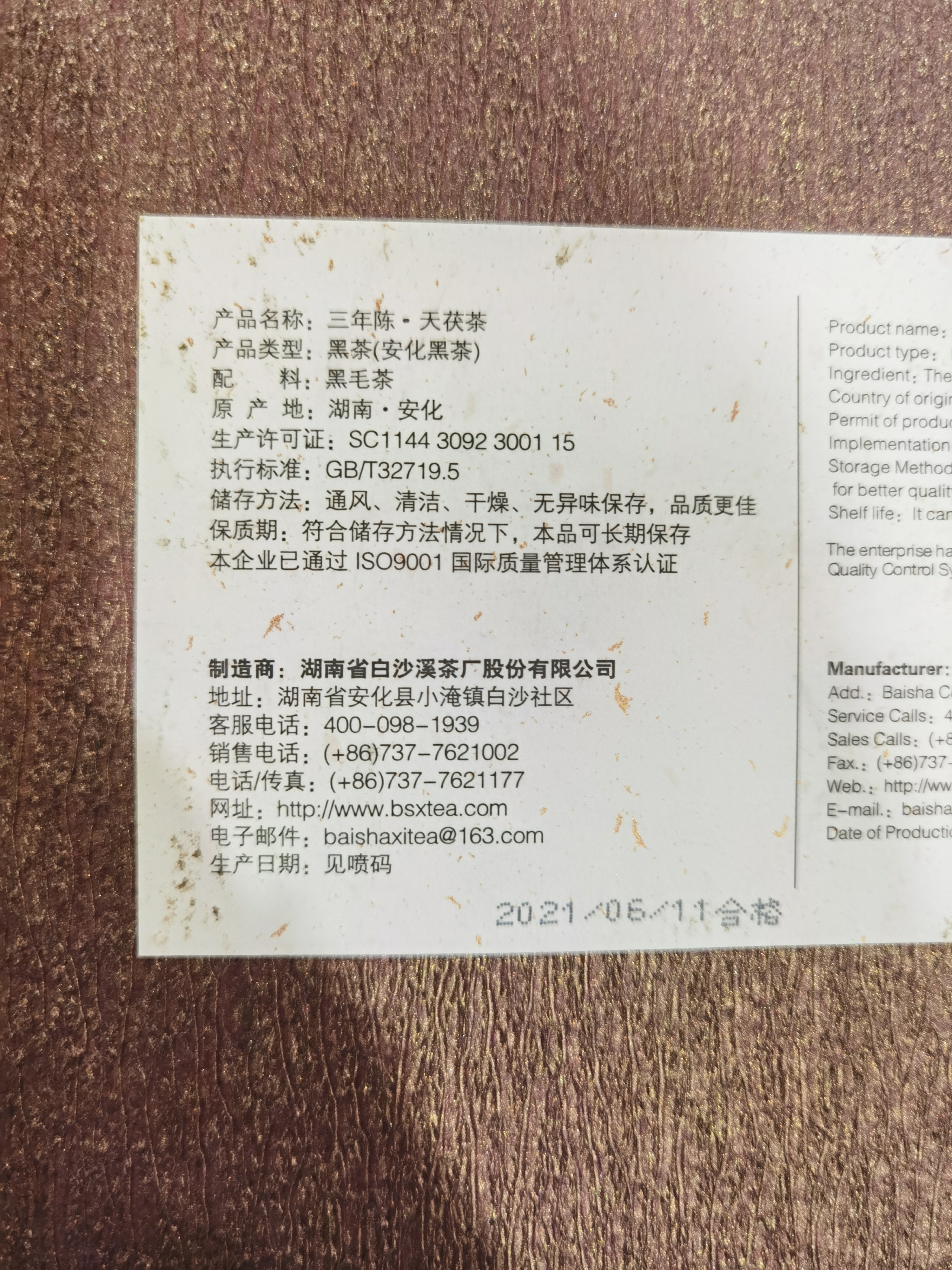 黑茶 白沙溪2021年三年陈天茯茶 礼盒装1kg