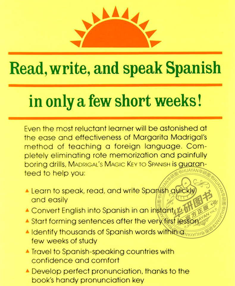 Even the mostreluctant learner will be astonished at the ease and effectiveness ofMargarita Madrigal’s method of teachinga foreign language. Completely eliminating rote memorization andpainfully boring drills,MADRIGAL’S MAGIC KEY TO SPANISH is guaranteed to help you:·Learn to speak, read, and write Spanish quickly and easily