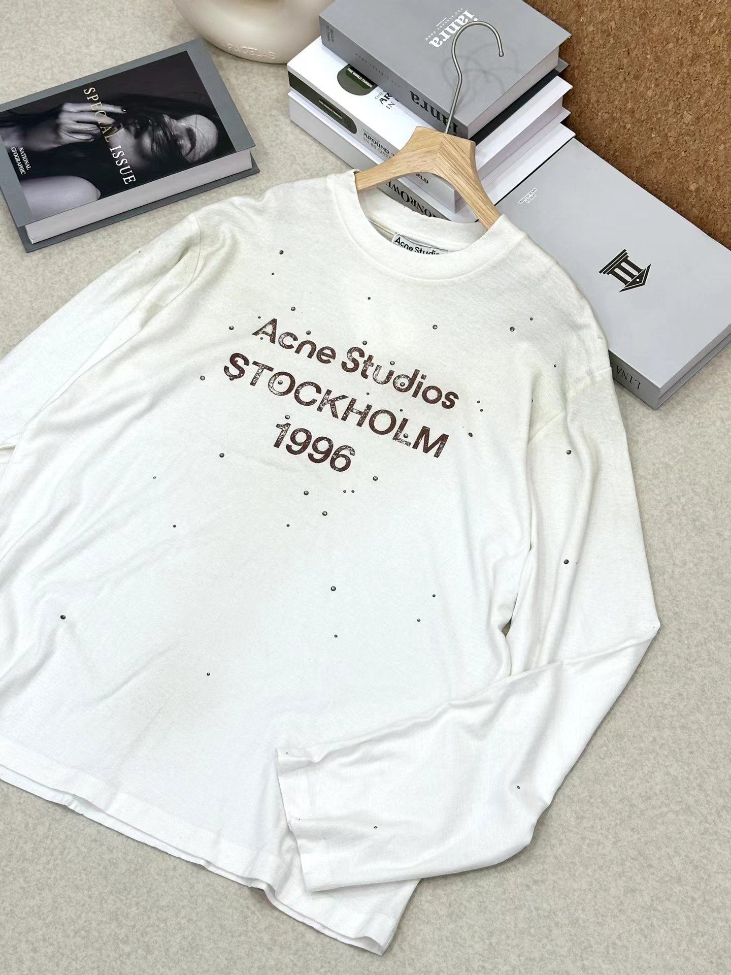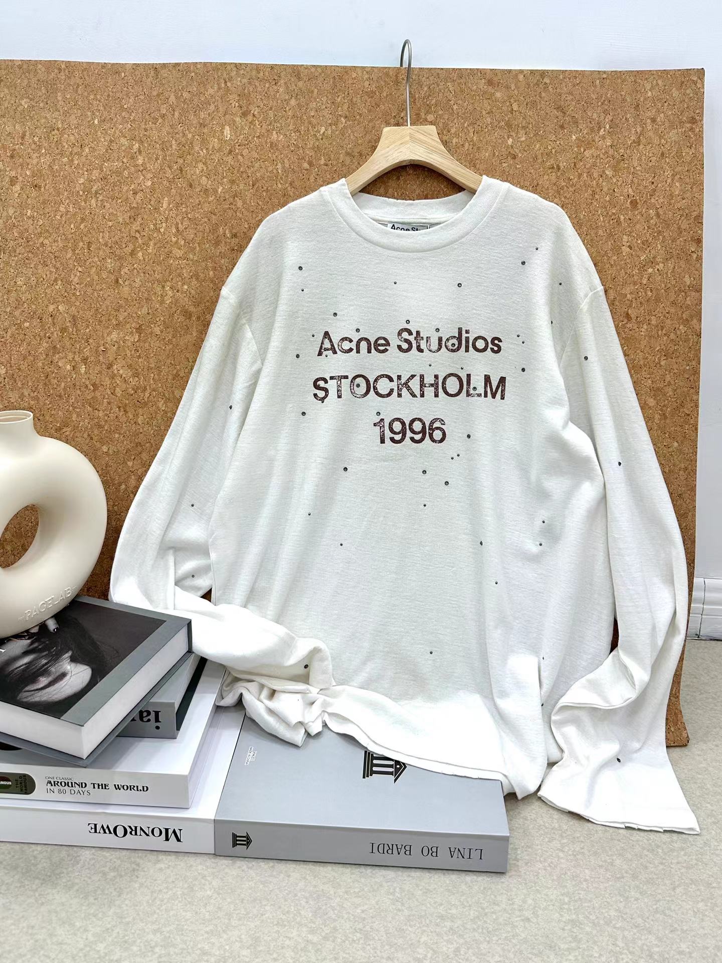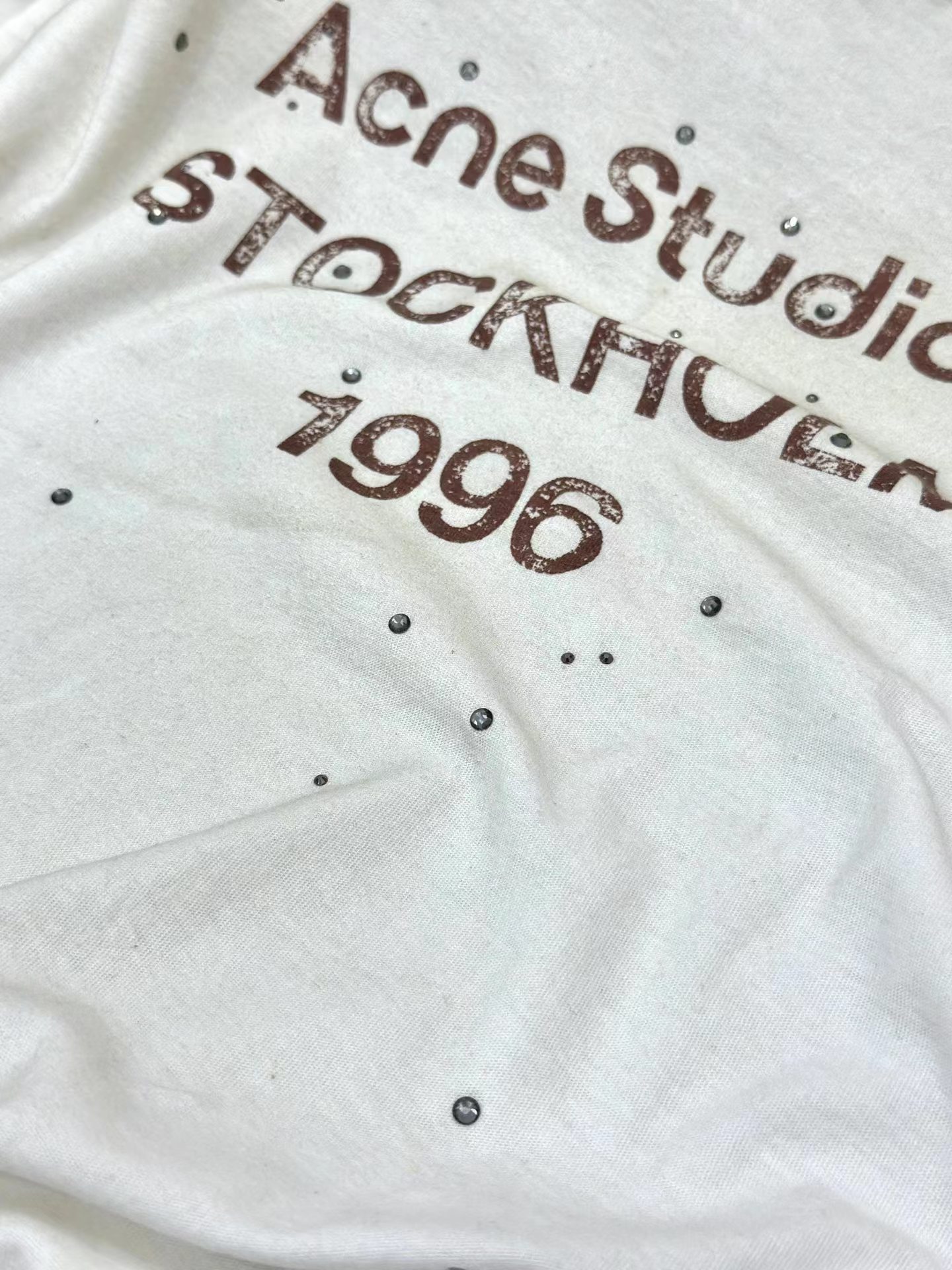抹布系列 破坏 麻棉长袖T定制含15%麻胚布 烫钻 复古做旧1996标语长袖T恤 85%棉。15%麻。面料质感:超柔 轻薄款 含麻也使得透气性出色 表面有轻微麻结颗粒感 垂感很好 穿上也感觉非常随性 白色为偏米一点点的 象牙白