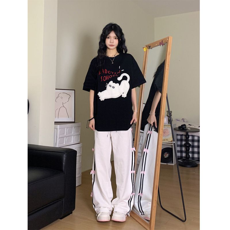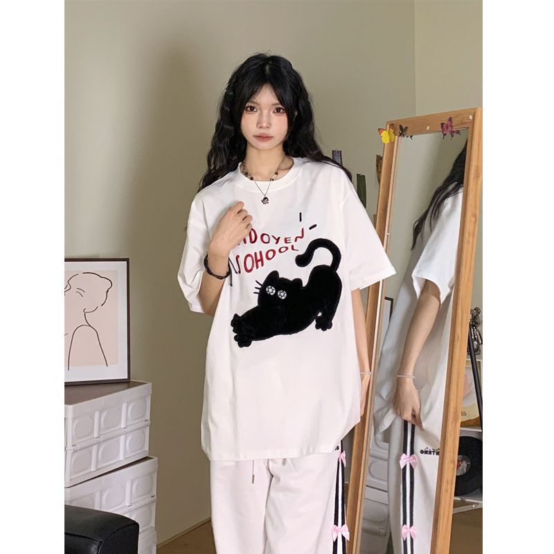 【多巴胺甜妹穿搭❗卡通猫咪短袖t恤】200克重磅印花,伸懒腰猫咪字母短袖,夏季新款宽松纯棉,纯棉情侣款短袖t恤L