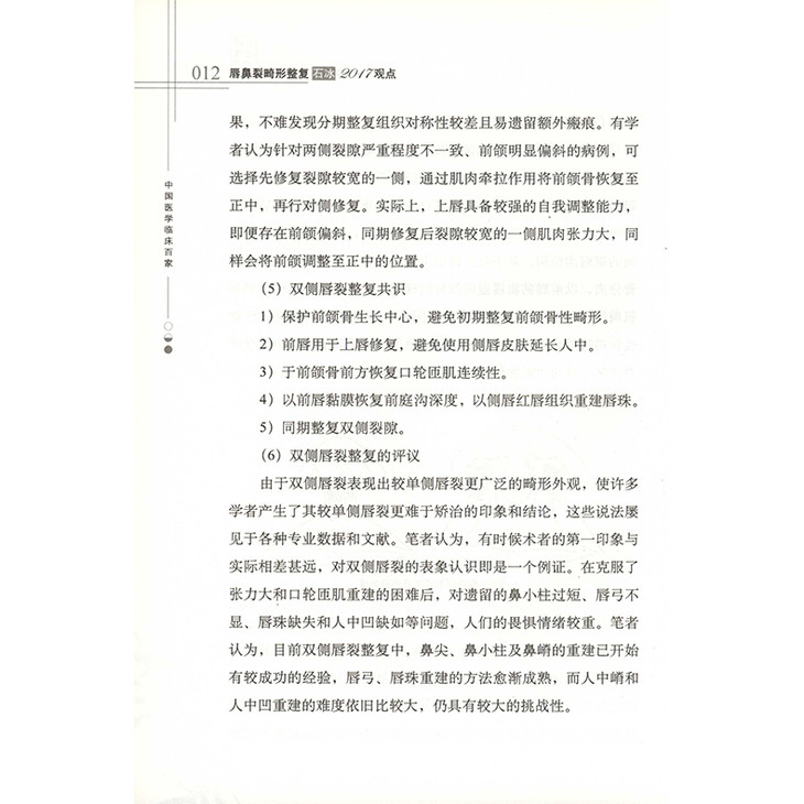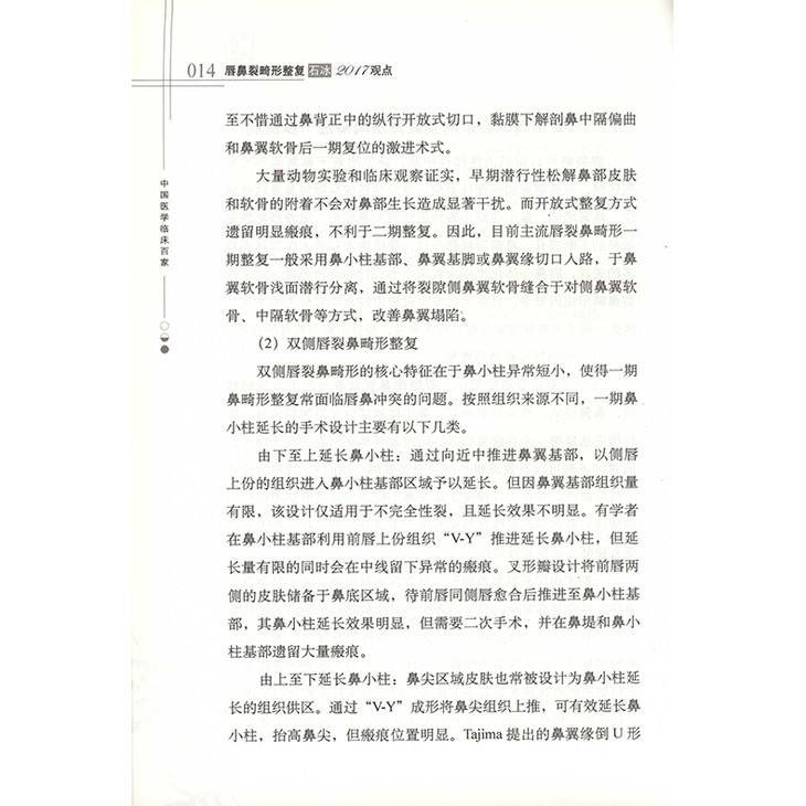 《唇鼻裂畸形整复石冰2017观点/中国医学临床百家》除主要对华西团队创建的初期和二期唇鼻畸形整复方法与原理进行了详细的介绍外,还专门对当今国际上*有影响力的几个唇鼻裂畸形整复方法予以介绍和评议,以便读者进行比较和理解华西唇腭裂团队方法的创新点。