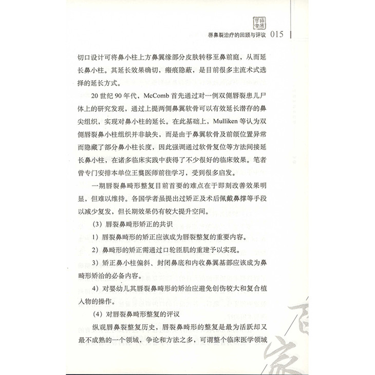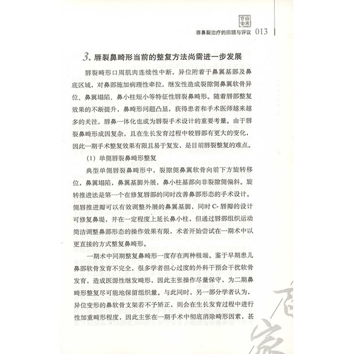 为了系统阐述近年来华西唇腭裂治疗团队在唇鼻裂治疗中的治疗理念和技术,《唇鼻裂畸形整复石冰2017观点/中国医学临床百家》起始部分引入了对相关唇鼻裂治疗历史的简要回顾与评议及华西唇腭裂治疗团队在唇鼻裂治疗中的研究方法和主要结果,以使读者理解华西团队的思路。