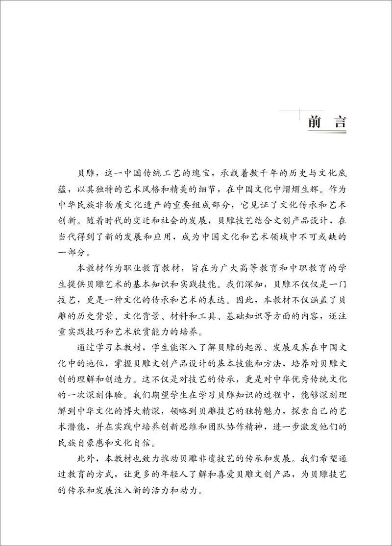 民 族 自 豪 感 和 文 化 自 信 。希 望 这 本 教 材 能 够 成 为 学 生 学 习 贝 雕 文 创 产 品 设
