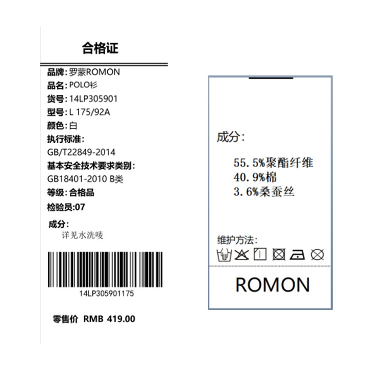 面料:55.5%聚酯纤维 40.9%棉 3.6%桑蚕丝