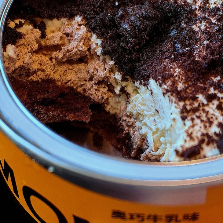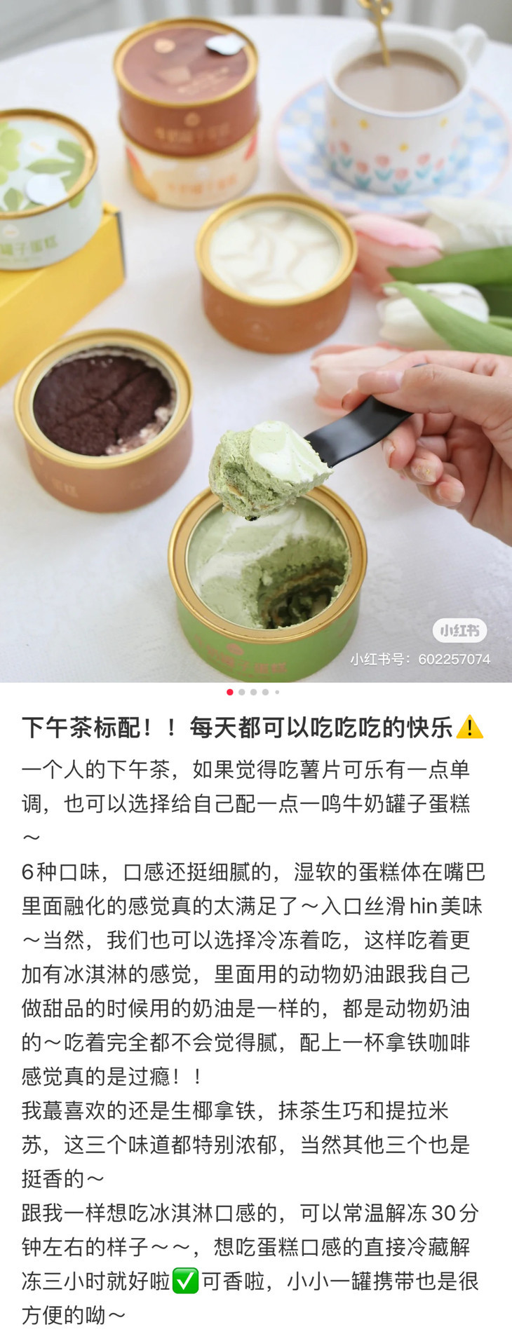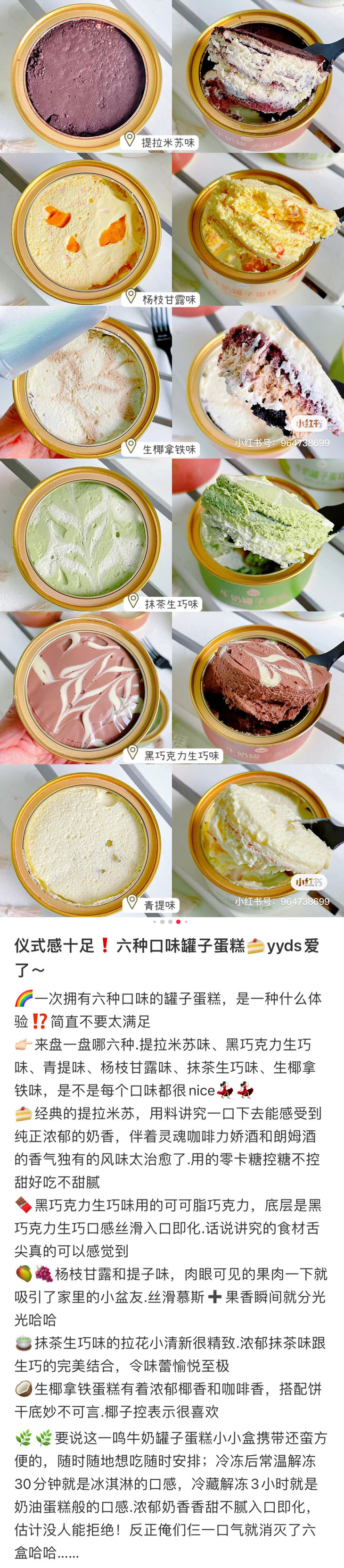 金罐蛋糕中,杨枝甘露酸甜慕斯胚体中嵌入大颗芒果和西柚果粒,稍带着轻微酸甜口感;青提口味是慕斯加上青提味爆爆珠以及大颗粒果肉,层次丰富之余还有夏日新鲜的气息; 抹茶生巧是用浓郁的生巧搭配清新的抹茶慕斯,从配方研发开始降低甜度,用海藻糖代替部分白砂糖,甘苦微甜; 黑巧克力生巧口味,是香醇浓郁的生巧搭配巧克力慕斯,略苦,但回味无穷; 提拉米苏是经典口味了,不用多说,酒香+奶香,很正!品牌还贴心主打“控糖不控甜”,慕斯中用0卡糖代替蔗糖,而且每盒都是小小的,也不怕吃超量了,放心大胆吃吧!