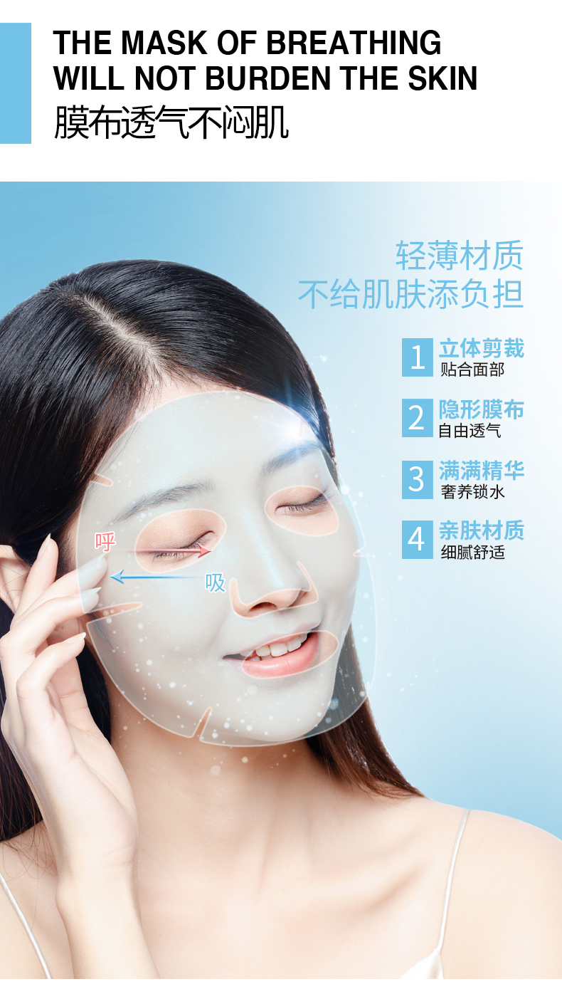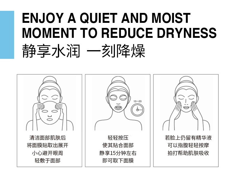 使用方法:洁肤后,避开眼周轻敷于面部,轻轻按压使其贴合面部,15分钟后即可取下面膜。若脸上仍留有精华液,可以用指腹轻轻按摩拍打至吸收