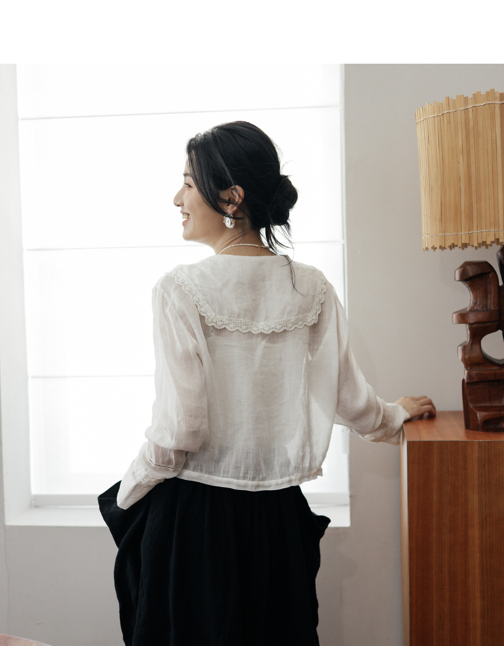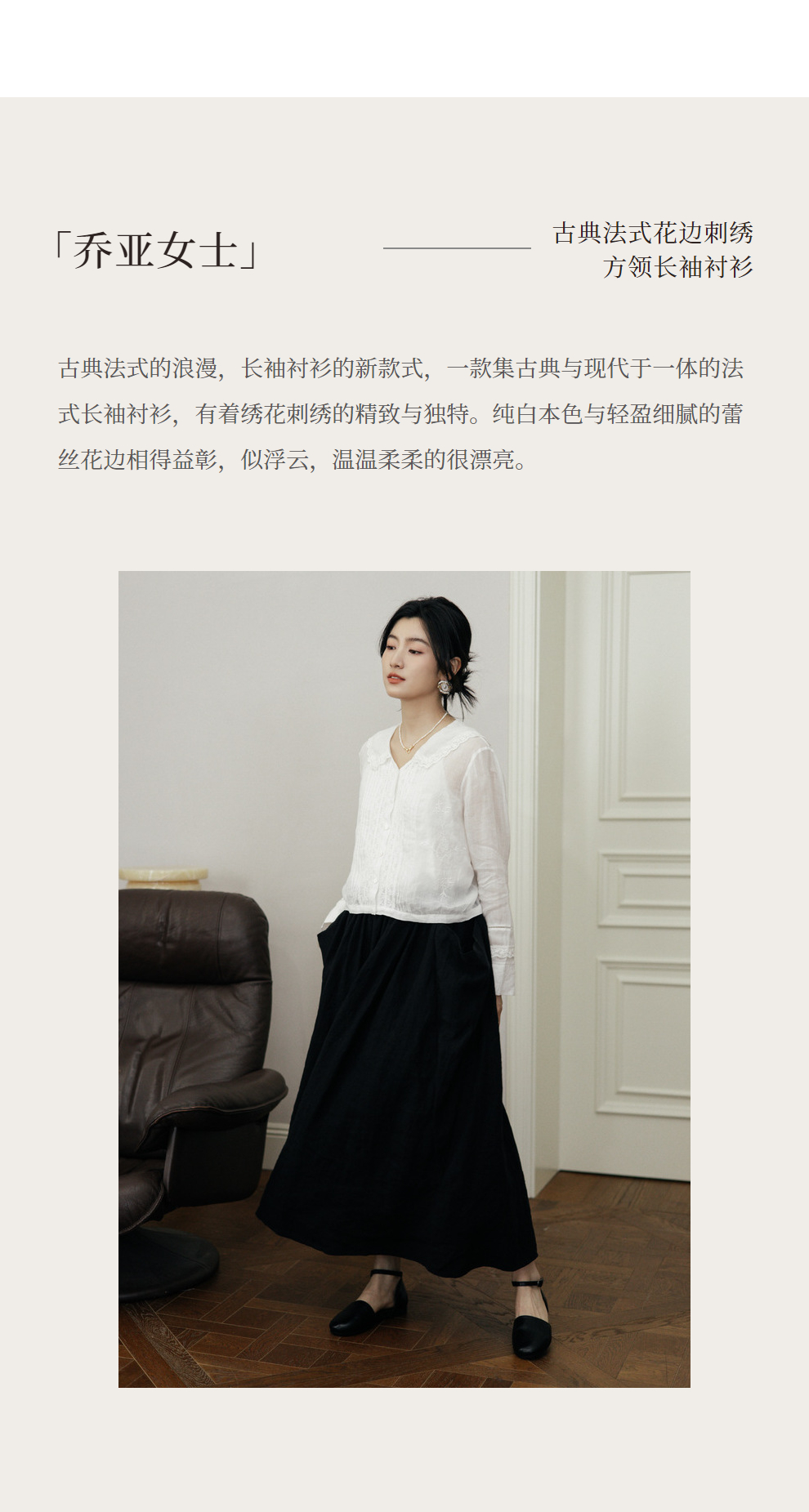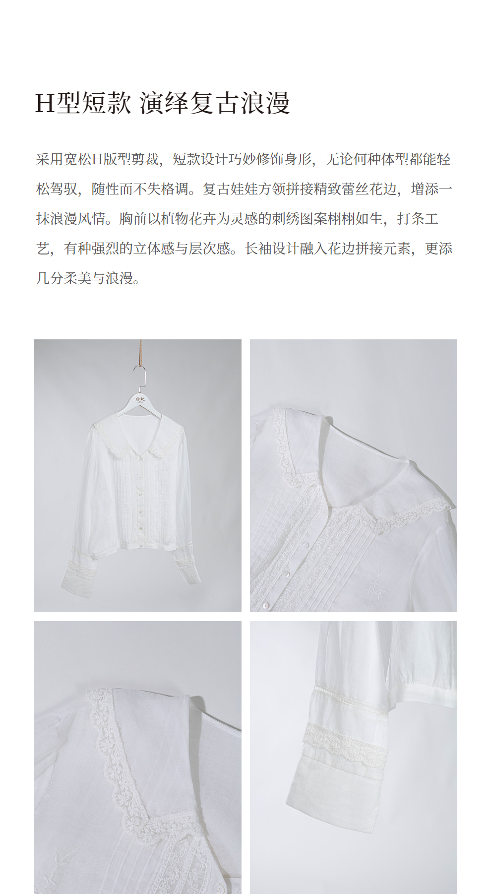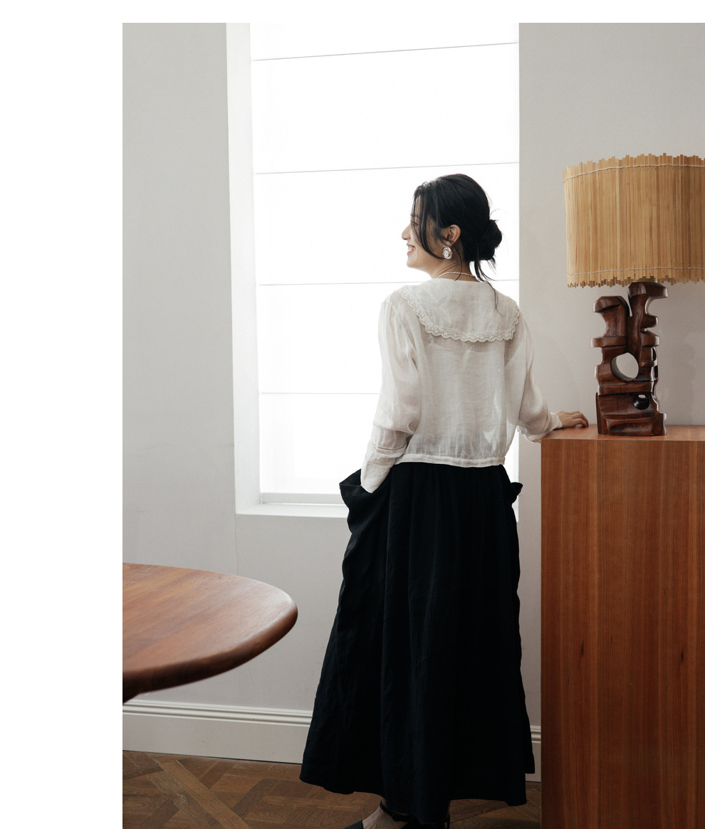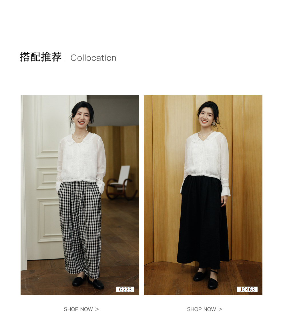绽放旅行女装502【黑白灰系列】古典法式花边刺绣方领长袖衬衫