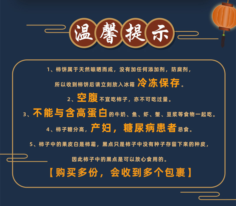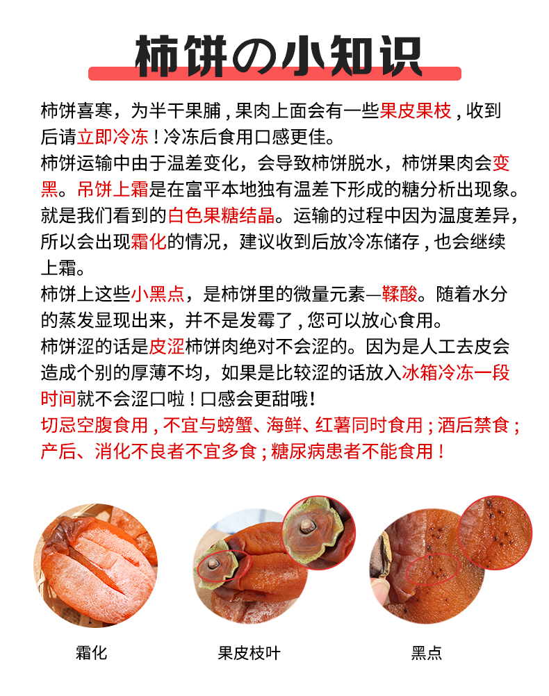 5、柿饼是按斤数发货,大小个数会有区间,表面有黑点或是柿饼里有核是正常现象,不在售后范围内!