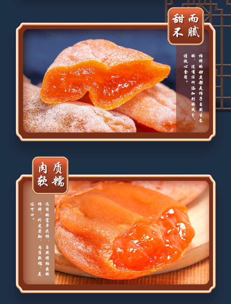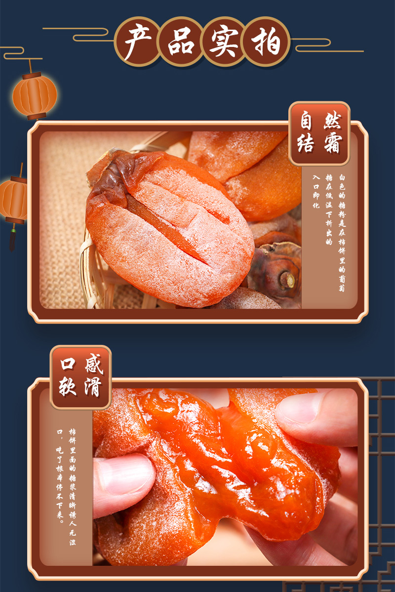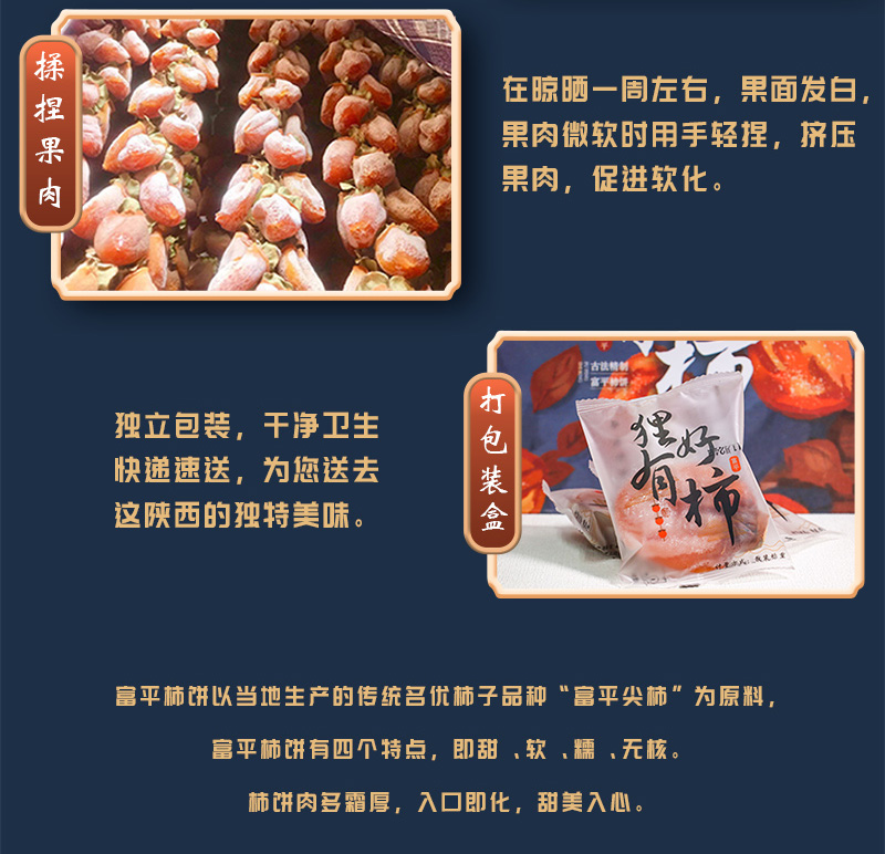 2、富平柿饼运输过程中,由于运输地区温度较高,柿饼表面霜会消融,这个正常现象,不影响食用,可以存放冰箱冷藏返霜。