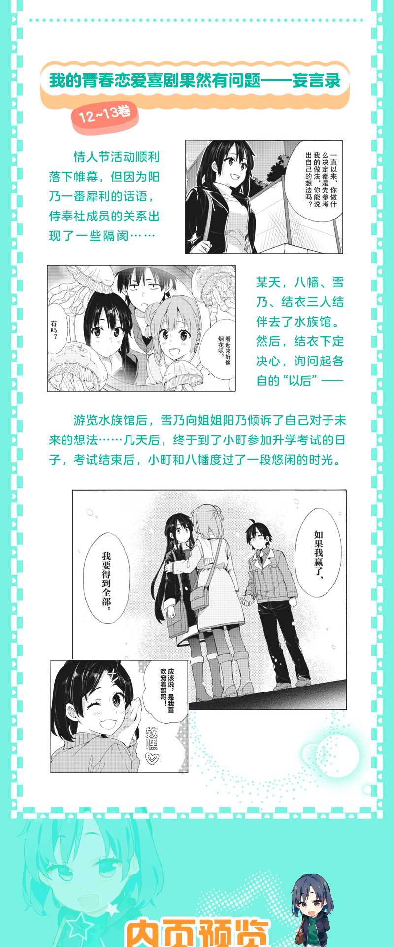 4.TV动画版官方漫画《我的青春恋爱喜剧果然有问题妄言录》开始连载以来,人气爆棚,情节依照动画走向,完全满足动画迷的喜好,增添更多番外细节以及相关彩蛋。