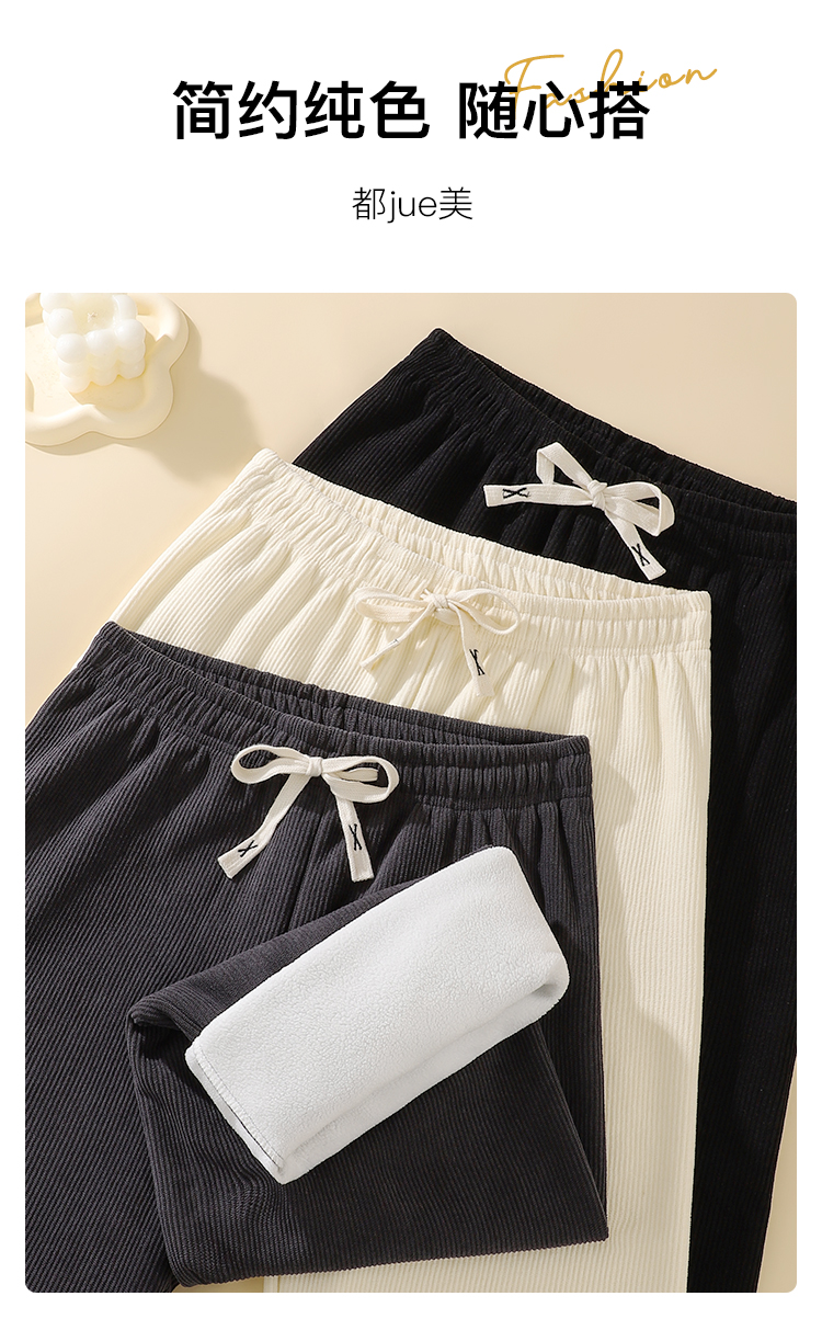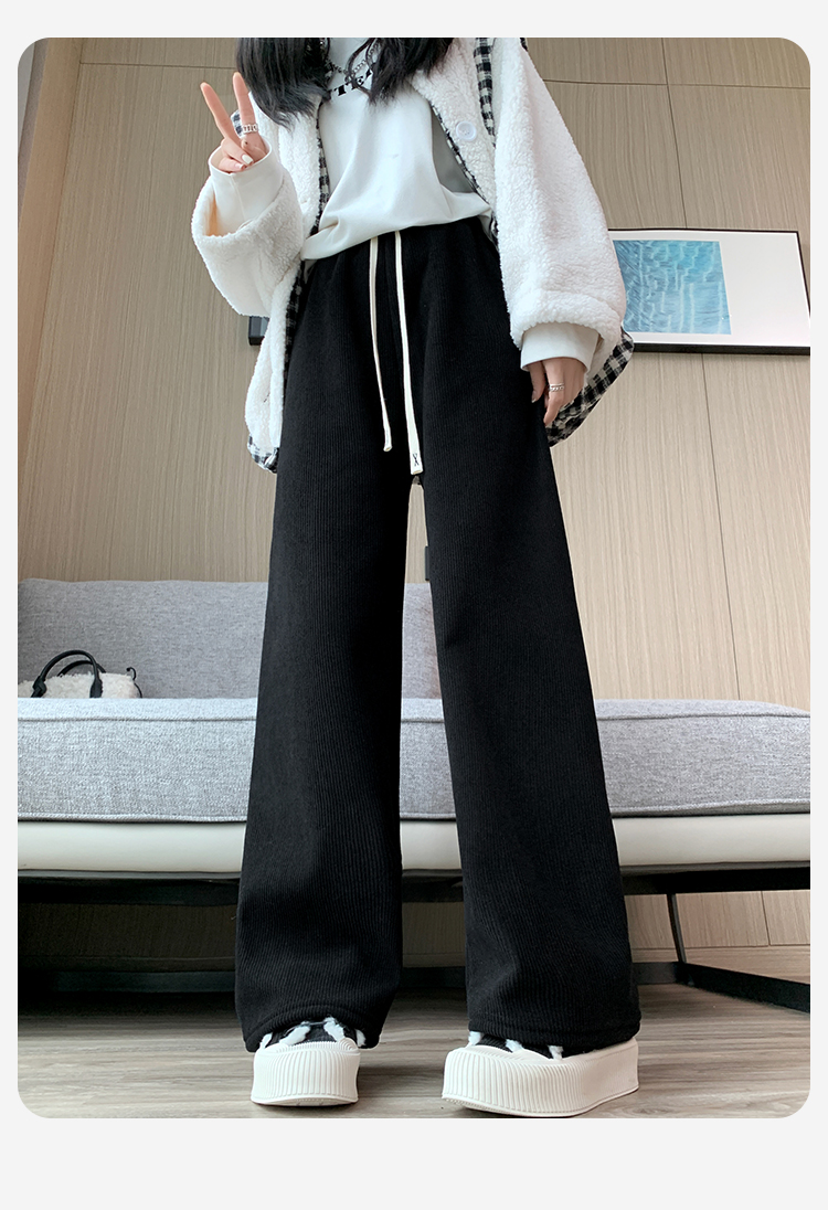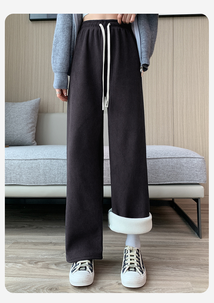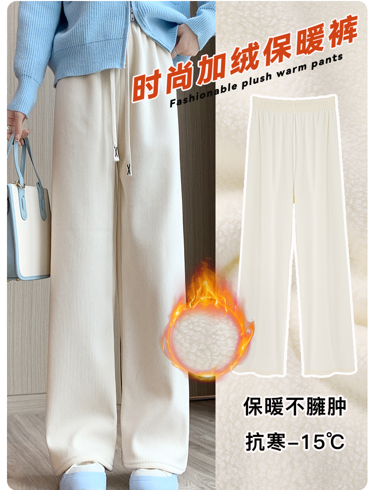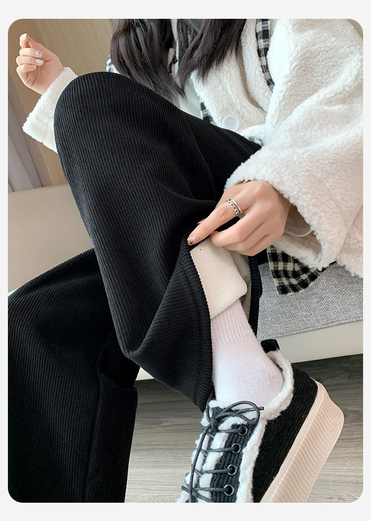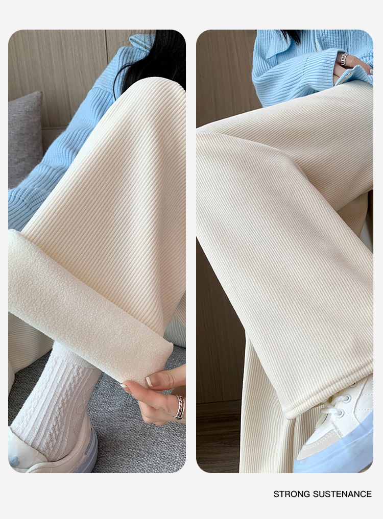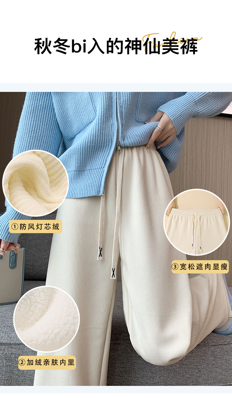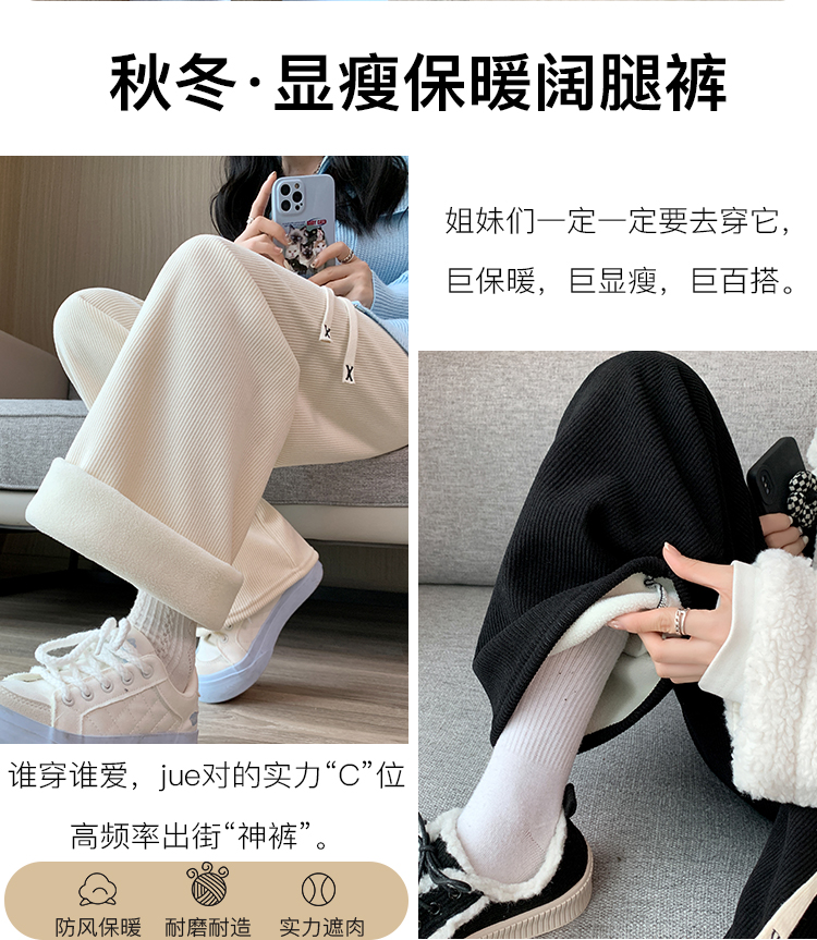 秋冬加绒阔腿裤女加厚保暖仿羊羔绒百搭直筒显瘦休闲裤长裤女加绒条纹裤