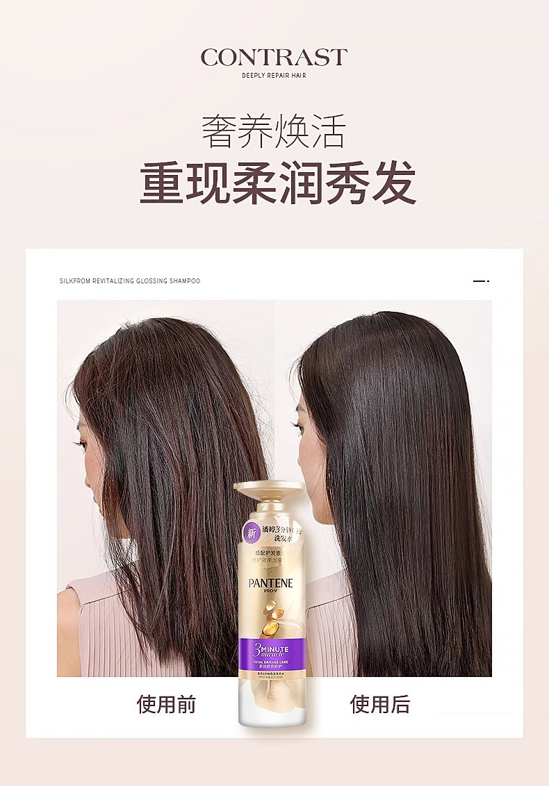 【潘婷三分钟奇迹臻养修护洗发乳】到手两瓶洗发乳 专研PRO-V配方,2大王牌成分,由内焕活秀发,三分钟时间,无限闪耀 3倍PRO-VB5精华,渗透发芯,强韧发丝发芯醇,充盈干枯发芯