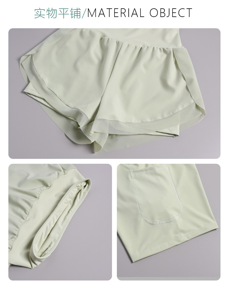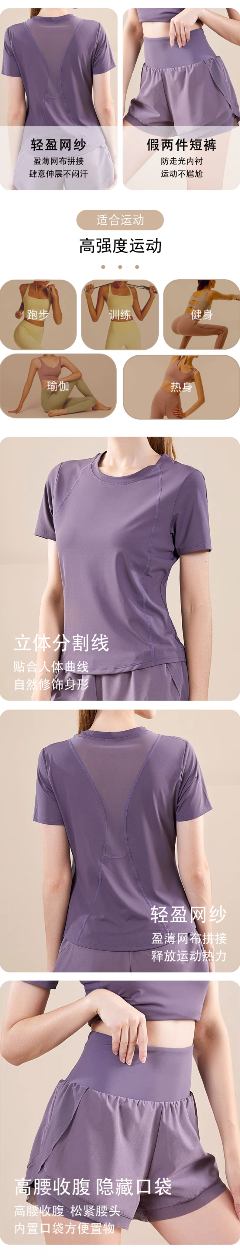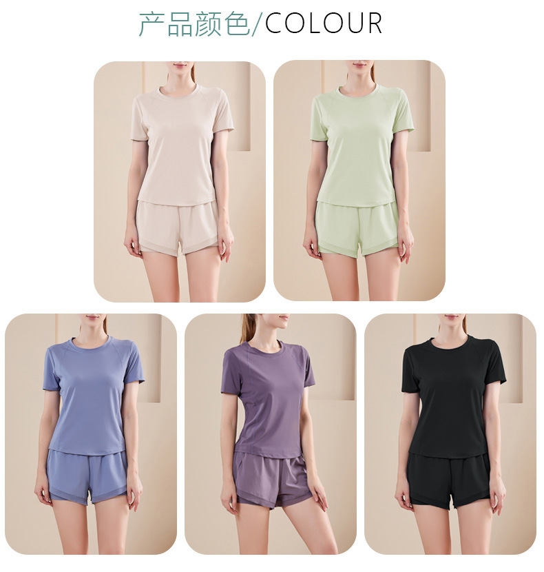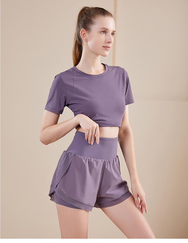 女士运动健身瑜伽服套装 网纱拼接短袖短裤跑步两件套(3-658)