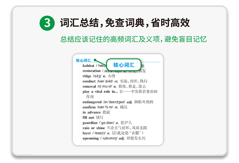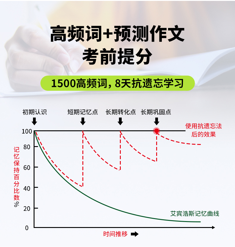 3. 高考应急锦囊包含1500高考核心词汇,用“抗遗忘”十步记忆法,8天速记核心词汇;另附20天预测作文,考前快速提分;
