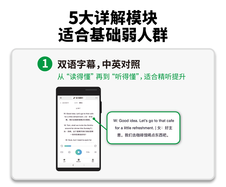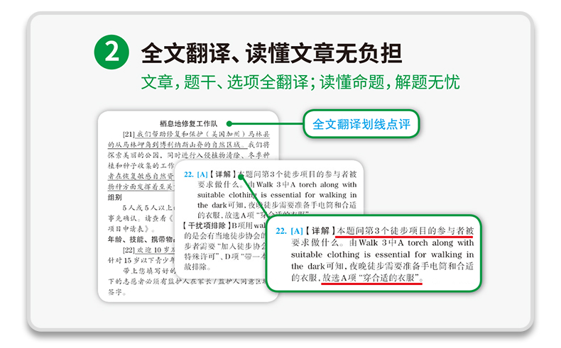 2. 真题淘金式详解5大模块,适合基础弱考生:听力双语字幕、全文翻译、难句归纳、词汇注释、写作翻译无生词;