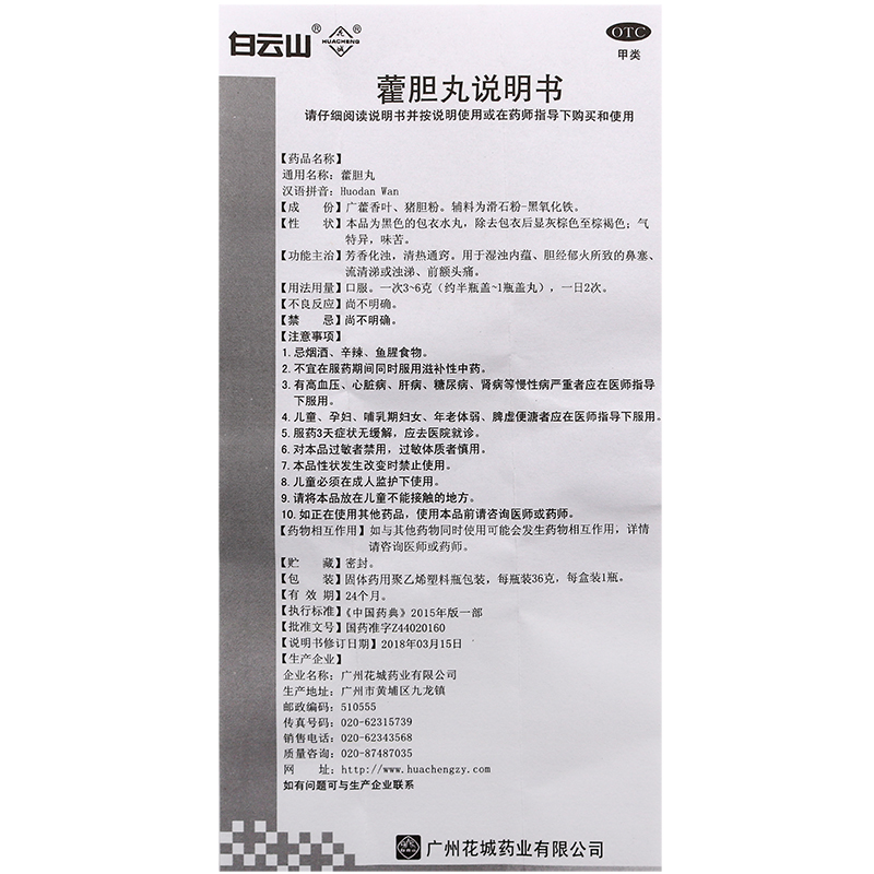 白云山花城藿胆丸36g 芳香化浊 清热通窍 湿浊内蕴 胆经郁