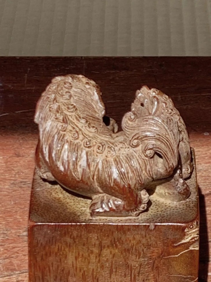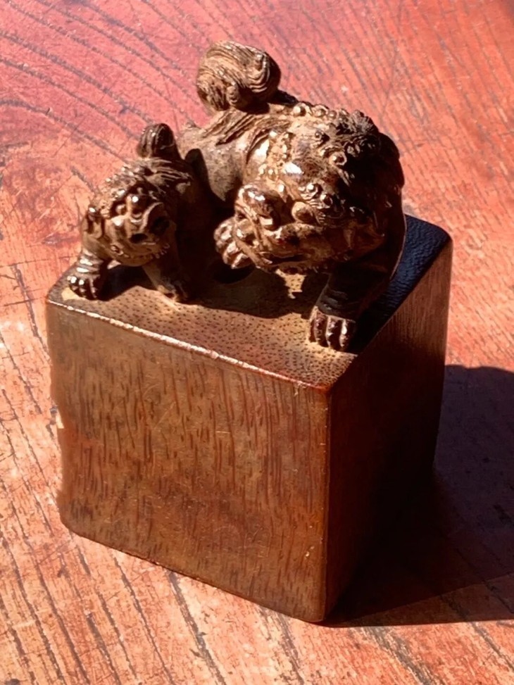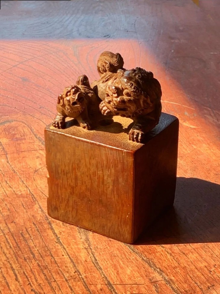 此貴气优雅的老竹根镂雕父子瑞狮钮玺印形方章,取材尺寸大的天然老竹根,如图所示,除边沿小磕碰伤、表面细微磨痕与风化纹,没有任何损伤。是一枚可盘玩、可展示之高雅竹根玺印形文人闲章。
