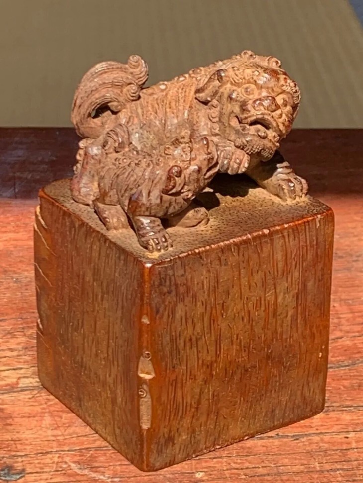 这是一只取天然老竹根镂雕父子瑞狮钮玺印状正方形印章,天然竹根质地坚硬、天然节疤纹理生动,切成高正方块后,上方镂雕公狮戏幼狮印钮,下方高正方印台,印面浅浮雕朱文篆体“以戒為師”,表面纹理浑然天成,生动优雅,尺寸不小,玺印造型典雅貴气。