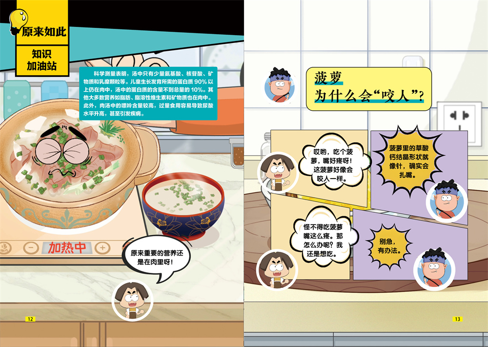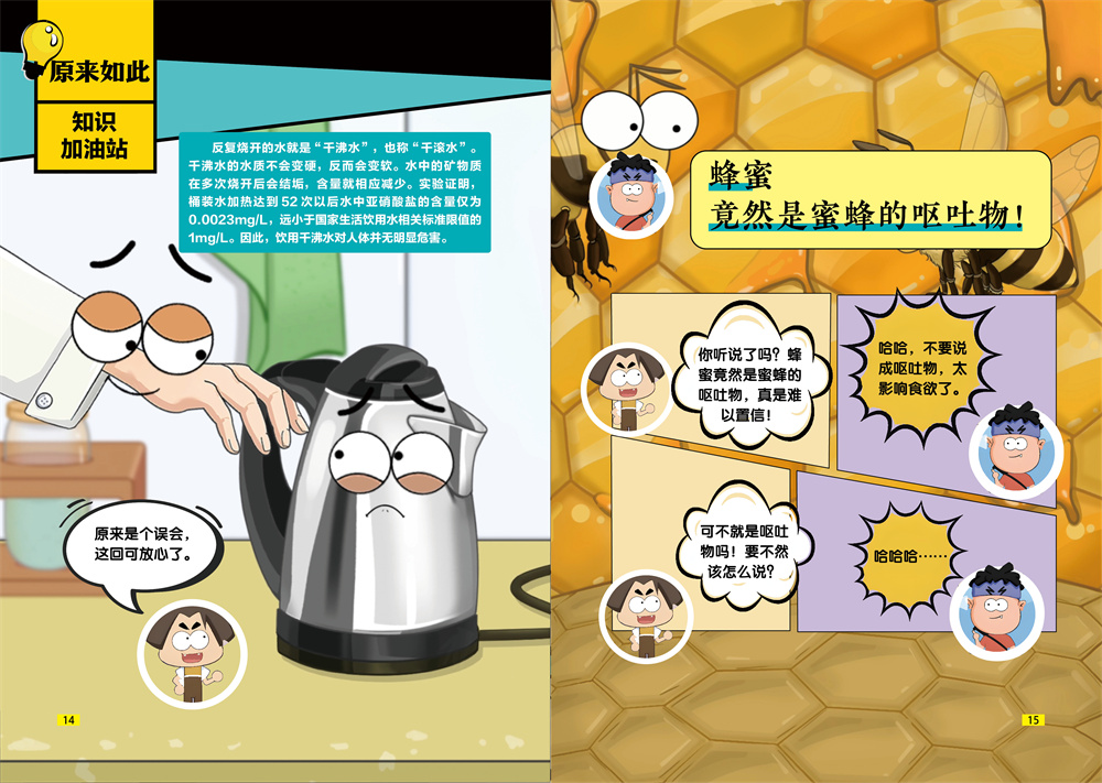 你知道吗?蜂蜜其实是蜜蜂的 ;呕吐物,考拉动作慢是被桉树叶 ;毒傻 的,羊的瞳孔竟然是长方形的 这些颠覆认知的冷知识,都藏在这套超有趣的科普漫画里!这套书用幽默漫画 十 硬核知识的形式,把生活里常见却被我们忽略的疑问一网打尽。从餐桌上的食材奥秘(菠菜为什么要焯水?西瓜中间为什么最甜?),到自然界的神奇生物(海龟性别由温度决定?猪笼草会吃肉?),再到生活中的健康误区(千沸水能不能喝?隔夜菜会不会中毒?),每一个问题都像一个小谜题,用轻松的对话和生动的画面,把复杂的科学原理讲得明明白白。趣味拉满:卡通人物吐槽式对话,让知识不再枯燥,孩子和大人都能笑着看完。内容扎实:覆盖生物、饮食、健康三大领域,200 十 个生活冷知识,既满足好奇心,又能学到实用常识。视觉友好:全彩漫画排版,重点知识用 ;知识加油站 提炼,轻松 get 核心要点,一看就懂、一学就会。翻开这本书,你会发现:身边的一草一木、一饭一菜,都藏着会 ;说话 的科学秘密。不管是孩子的好奇心,还是大人的生活困惑,都能在这里找到有趣又靠谱的答案!