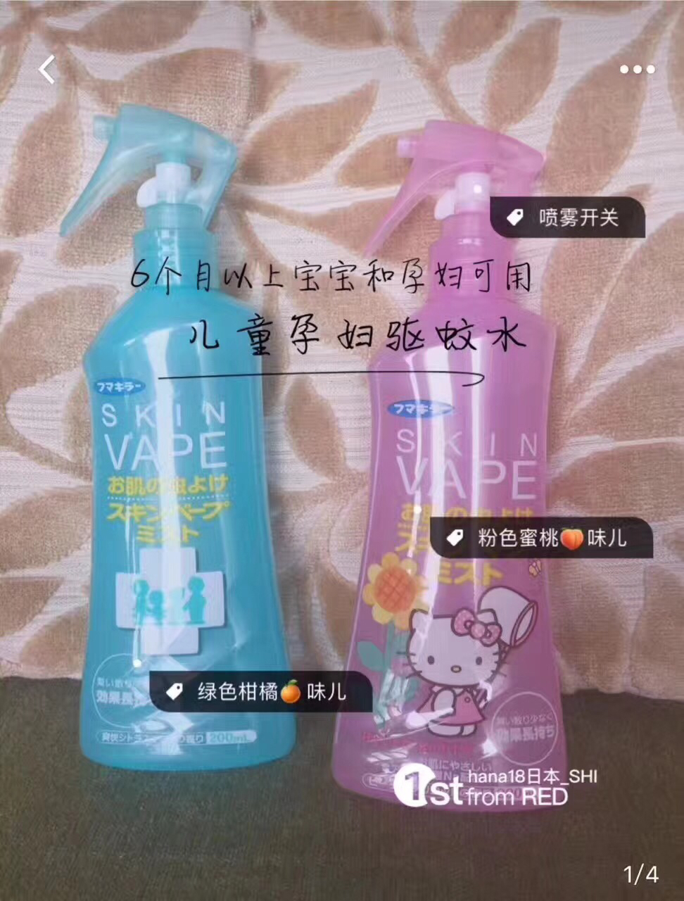 实惠日本VAPE儿童防蚊喷雾200ml 成分安全适合婴儿/儿童/成人适用不伤肌肤,这款驱蚊水在日本非常受妈妈亲睐,淡淡的香味很好闻,自家体验最有效的驱蚊喷剂,反正多喷几下不心疼,不仅防虫还防跳蚤、螨、蝇、臭虫等,使用的时候将白色扳手转到open位置就开喷啦!绿色柑橘味,粉色kitty蜜桃味