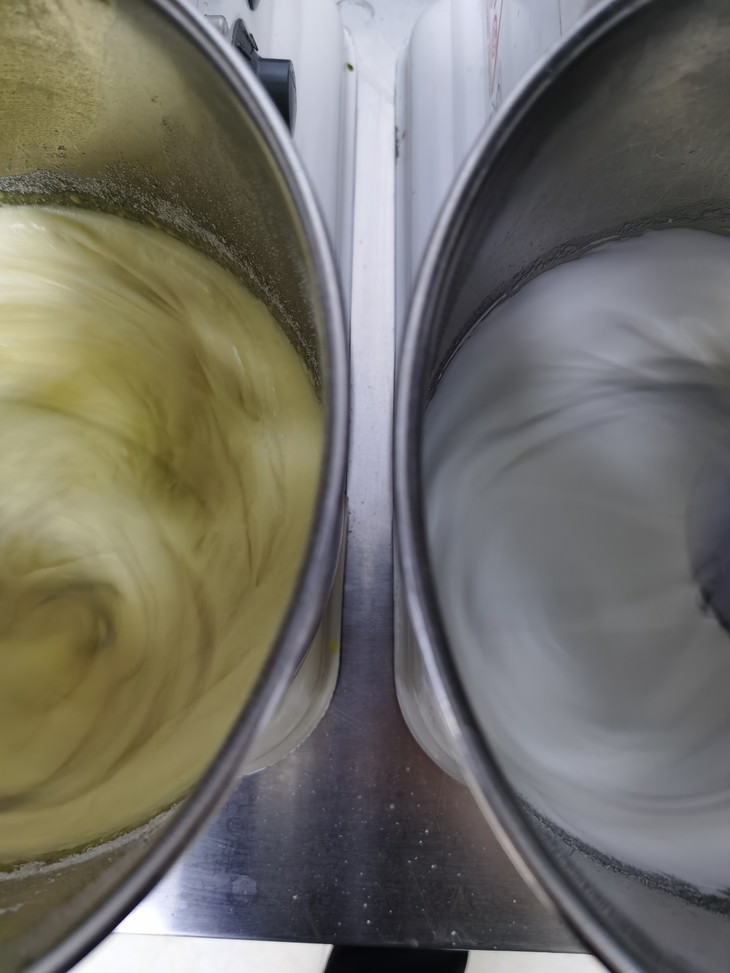 3.将桶壁上的混合物刮落回桶内,再次搅拌。完成黄油霜的制作。